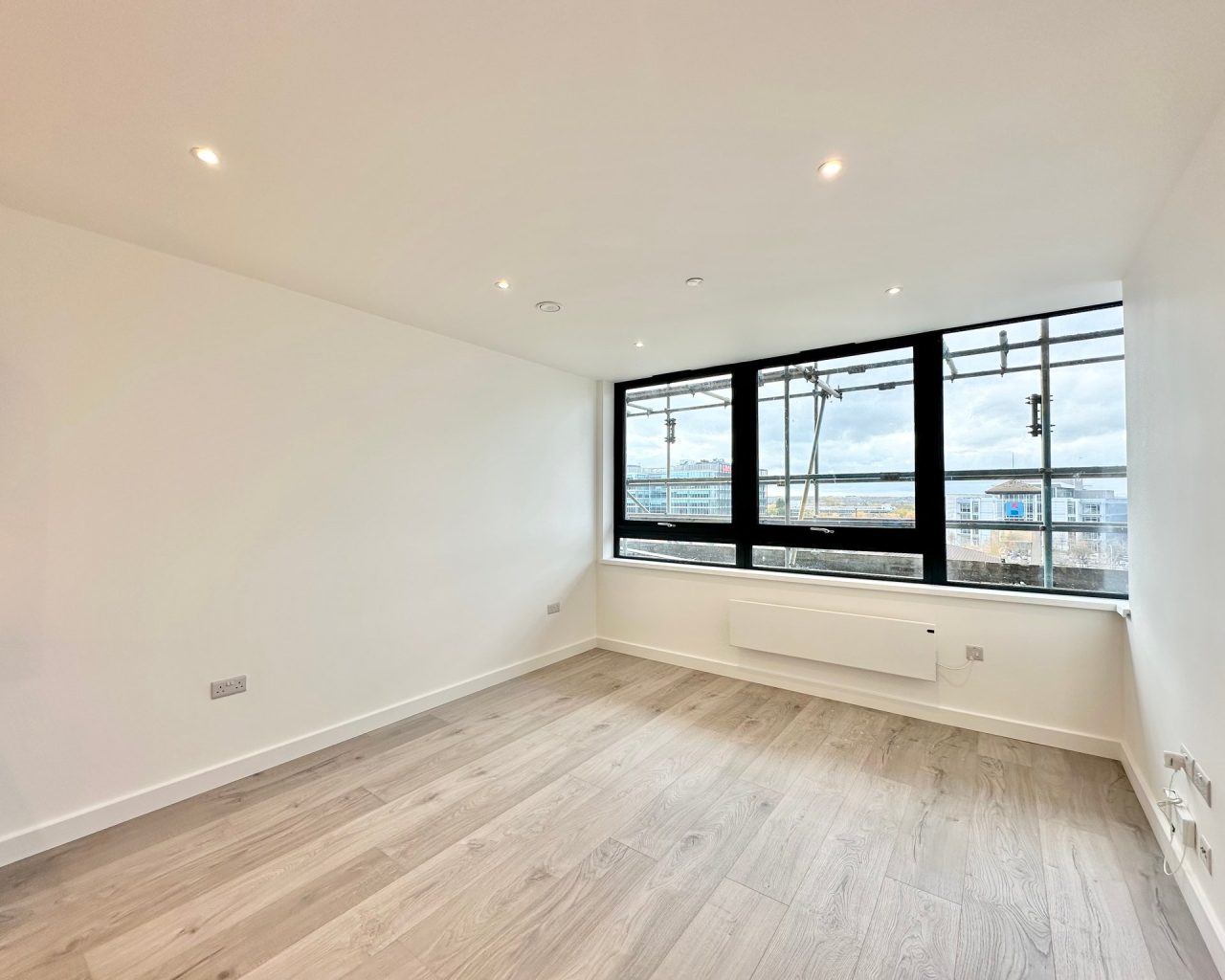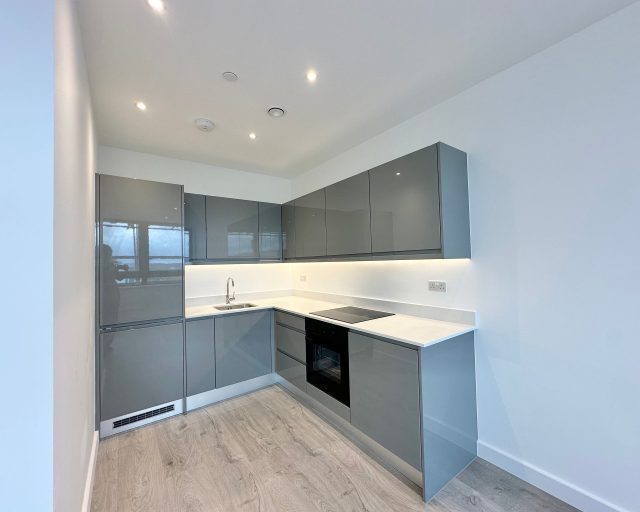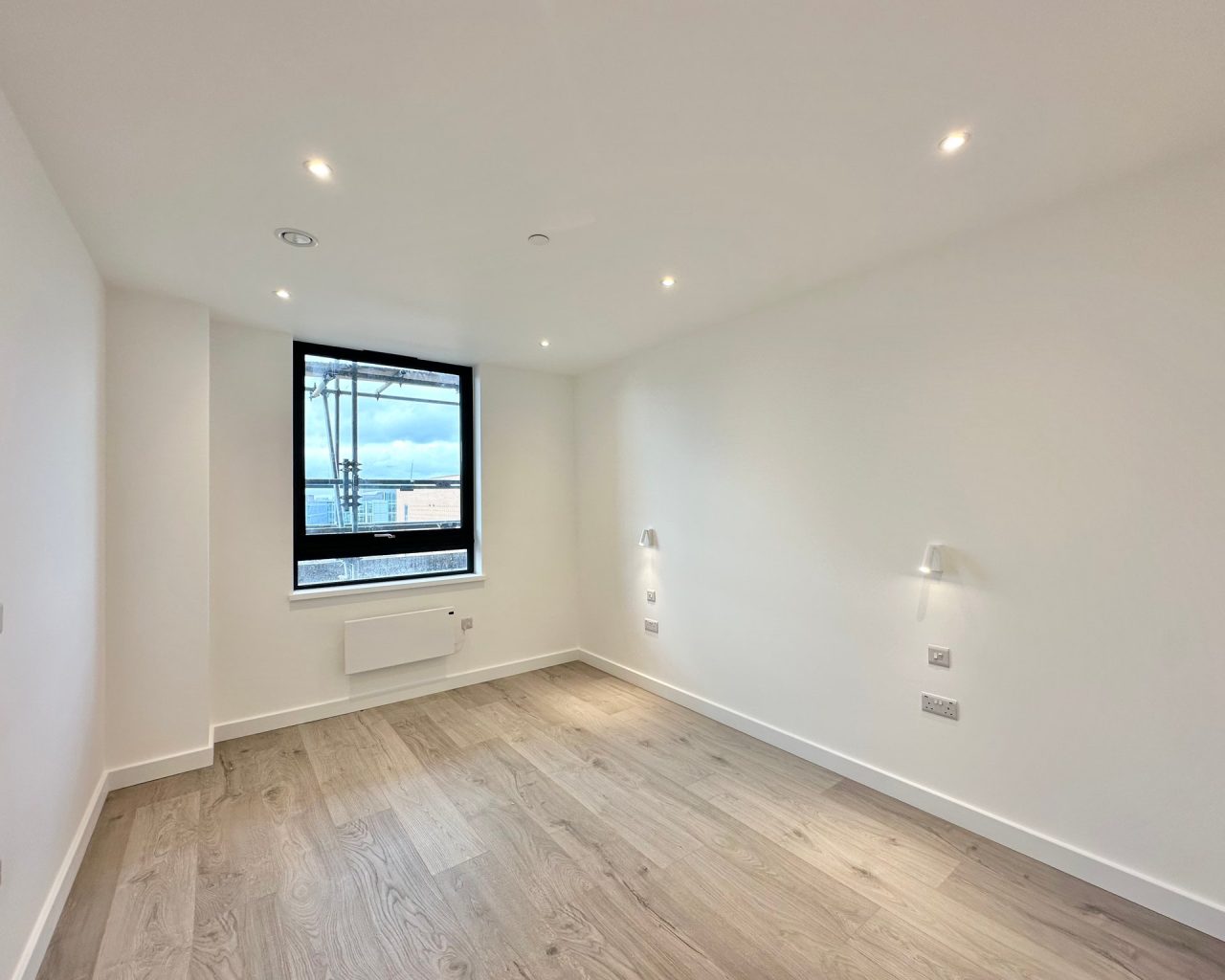 This brand new apartment has been thoughtfully designed to maximize space and light, featuring a spacious open-plan kitchen, dining, and living area with large windows that flood the space with natural light and views across central Milton Keynes. The contemporary kitchen comes complete with high-quality fittings, and the entire apartment is finished with high quality flooring and ultra-high ceilings that enhance the sense of openness and sophistication. The generously sized double bedroom offers a flexible layout. The main bathroom is fully tiled and features a shower-over-bath, heated towel rail, and a large LED-lit mirror, combining function with style.