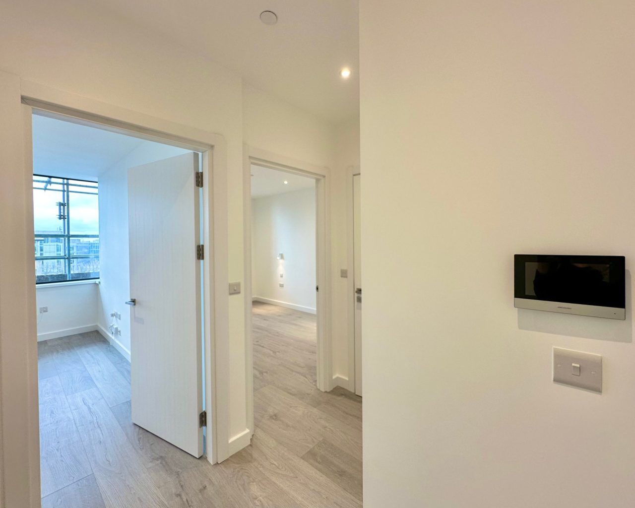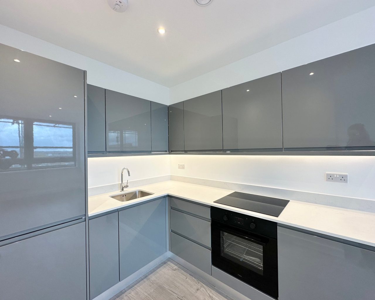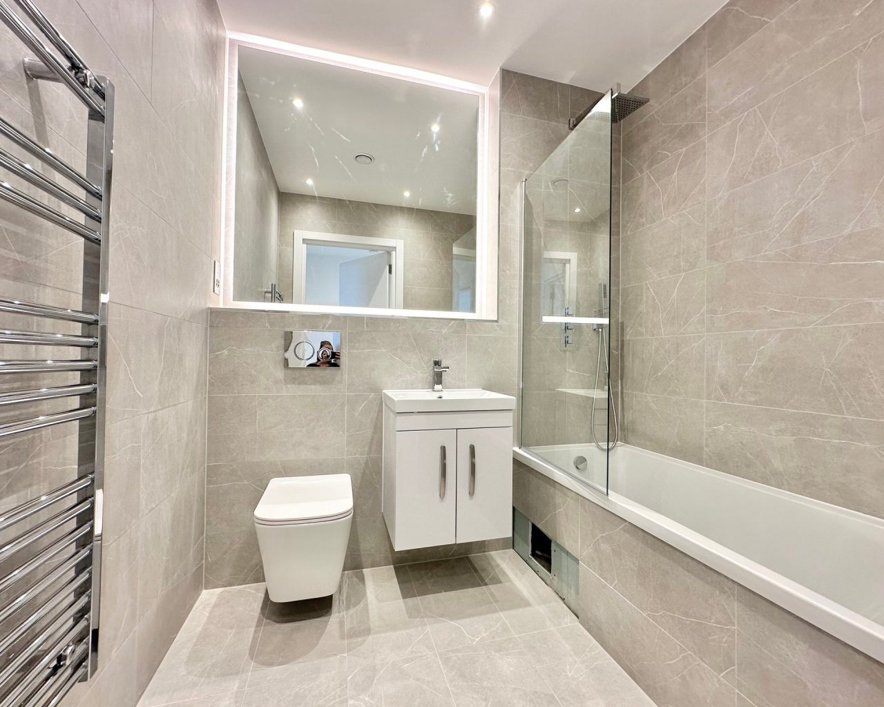This brand new apartment has been thoughtfully designed to maximize space and light, featuring a spacious open-plan kitchen, dining, and living area with large windows that flood the space with natural light and views across central Milton Keynes. The contemporary kitchen comes complete with high-quality fittings, and the entire apartment is finished with high quality flooring and ultra-high ceilings that enhance the sense of openness and sophistication. The generously sized double bedroom offers a flexible layout. The main bathroom is fully tiled and features a shower-over-bath, heated towel rail, and a large LED-lit mirror, combining function with style.