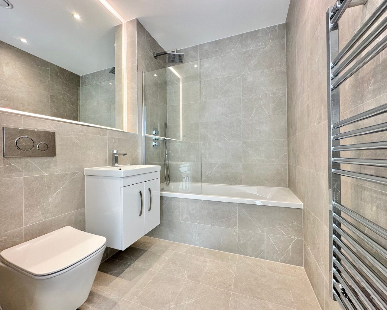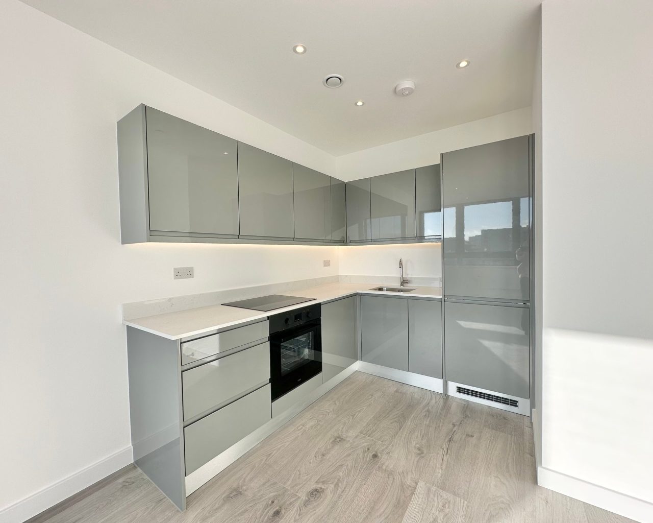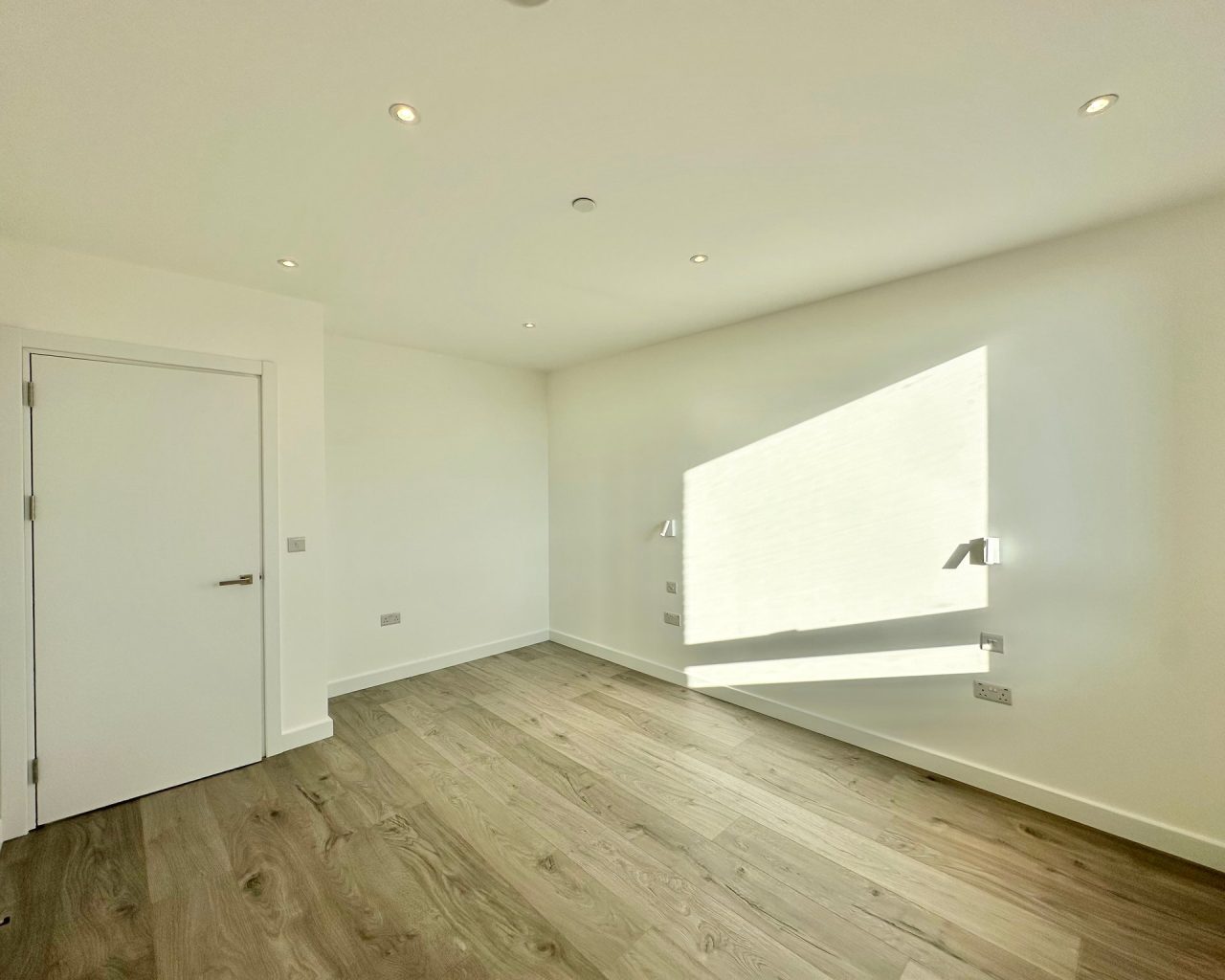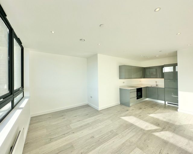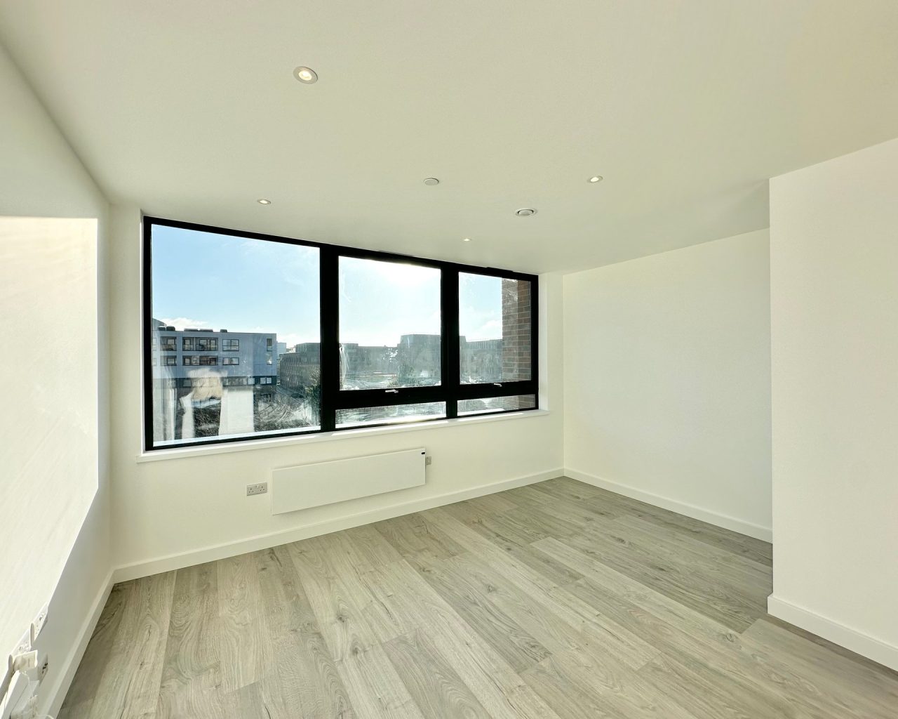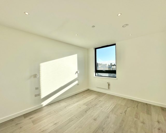 This brand new fourth floor apartment has been thoughtfully designed to maximize space and light, featuring a spacious open-plan kitchen, dining, and living area with large windows that flood the space with natural light and views across central Milton Keynes. The contemporary kitchen comes complete with high-quality fittings, and the entire apartment is finished with high quality flooring and ultra-high ceilings that enhance the sense of openness and sophistication. The generously sized double bedroom offers a flexible layout. The main bathroom is fully tiled and features a shower-over-bath, heated towel rail, and a large LED-lit mirror, combining function with style.
