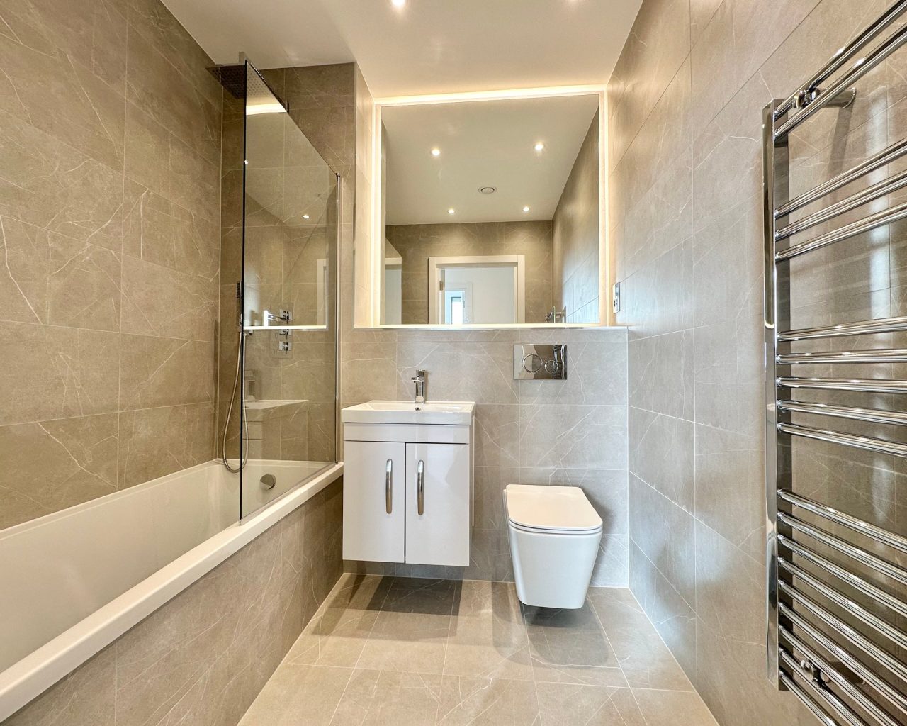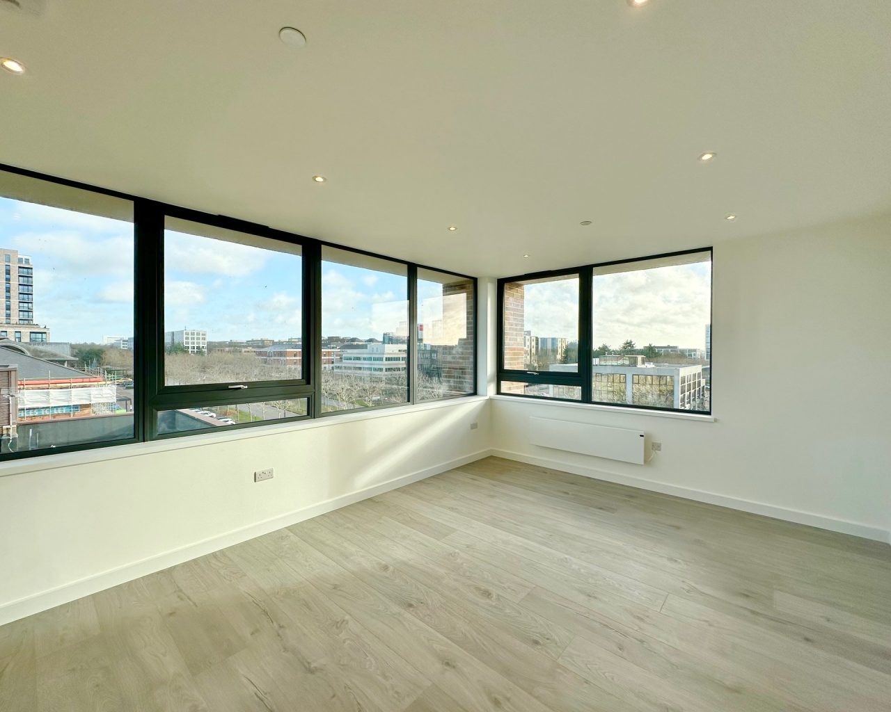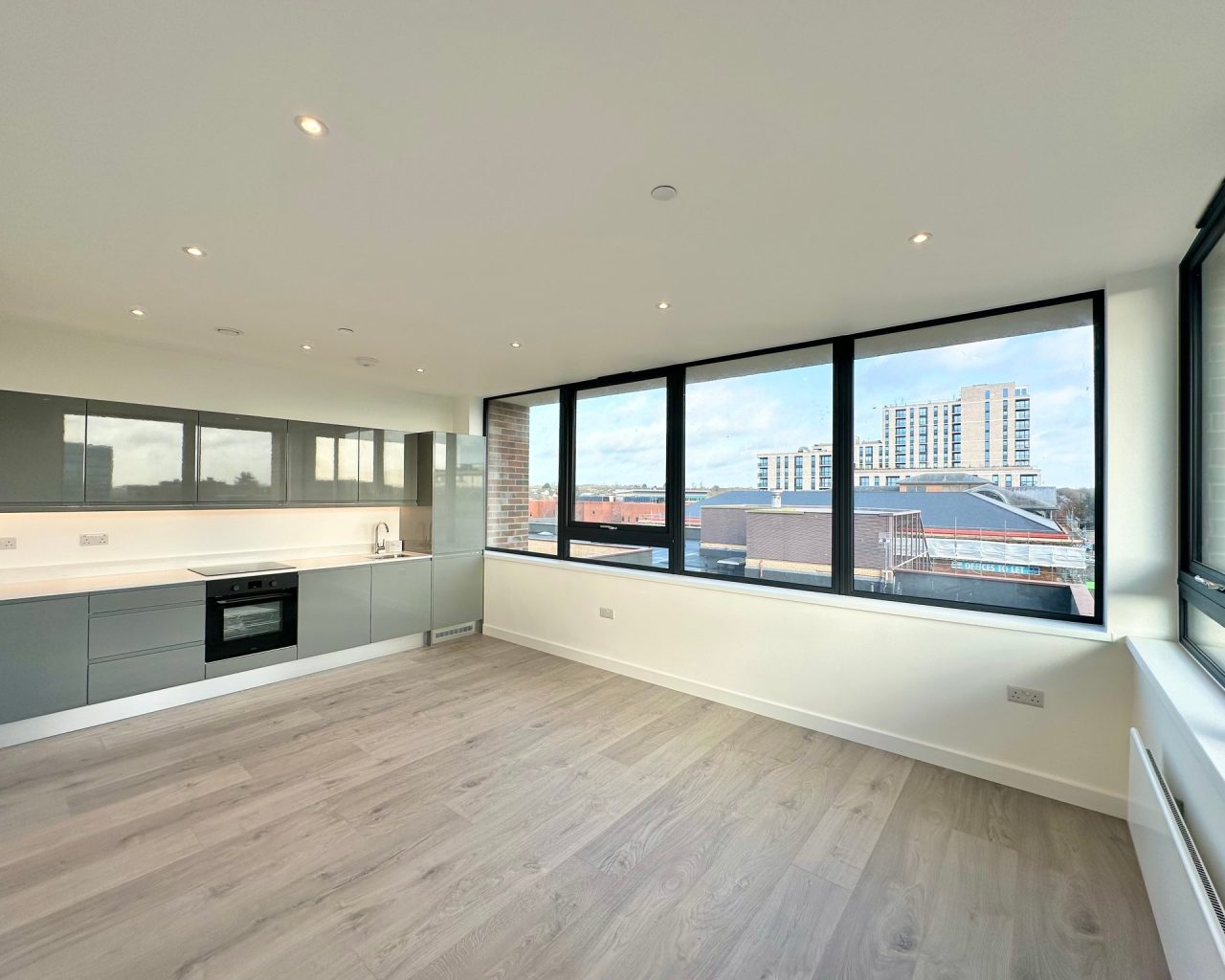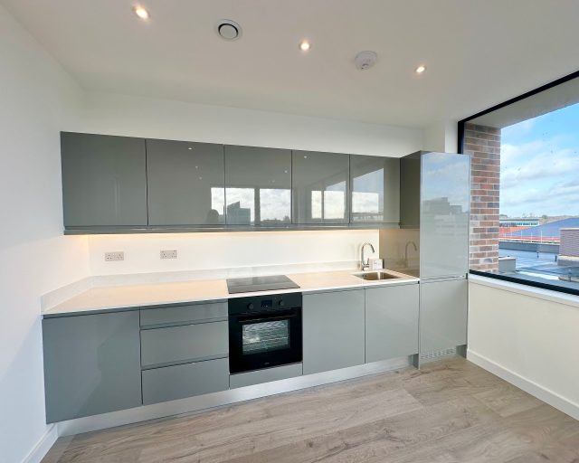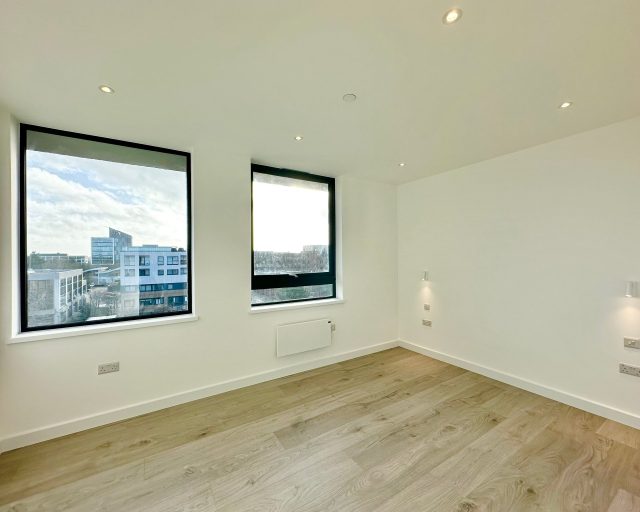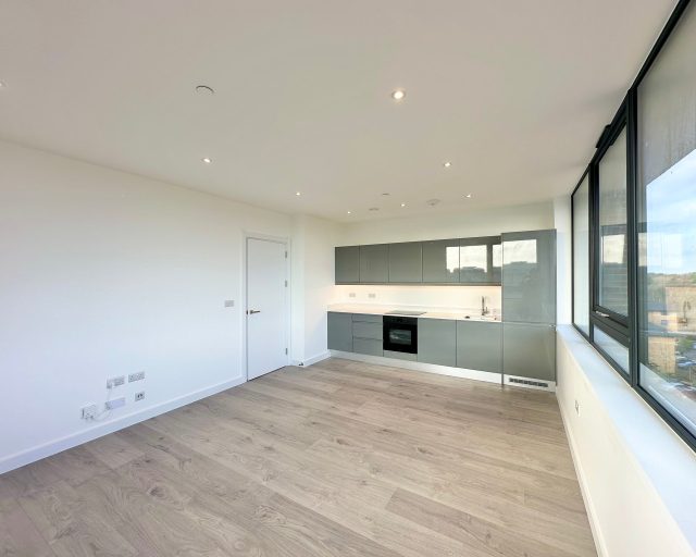 This brand new apartment has been thoughtfully designed to maximize space and light, featuring a spacious open-plan kitchen, dining, and living area with large windows that flood the space with natural light and views across central Milton Keynes. The contemporary kitchen comes complete with high-quality fittings, and the entire apartment is finished with high quality flooring and ultra-high ceilings that enhance the sense of openness and sophistication. The generously sized double bedroom offers a flexible layout. The main bathroom is fully tiled and features a shower-over-bath, heated towel rail, and a large LED-lit mirror, combining function with style.
