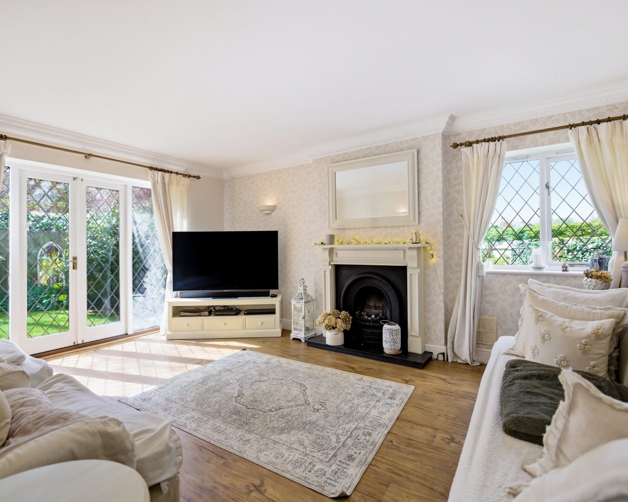 From the outset, the property makes a strong impression, boasting a substantial driveway with space for up to five vehicles, alongside a single garage with remote-controlled electric door. The home also benefits from an EV charging point, adding further convenience for modern lifestyles. Upon entering, you’re welcomed into a thoughtfully designed ground floor. To the right sits a generously proportioned study—ideal for home working or a quiet retreat. The main lounge offers a warm and inviting space, complete with double doors that open directly onto the garden, creating a seamless connection between indoor and outdoor living.