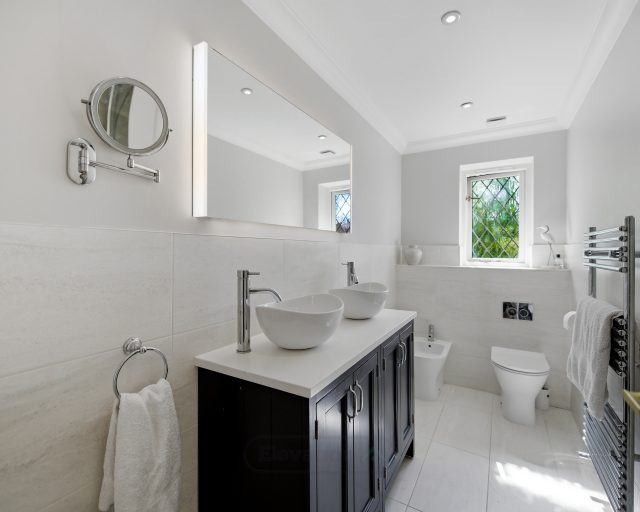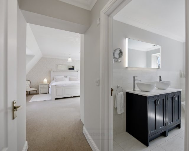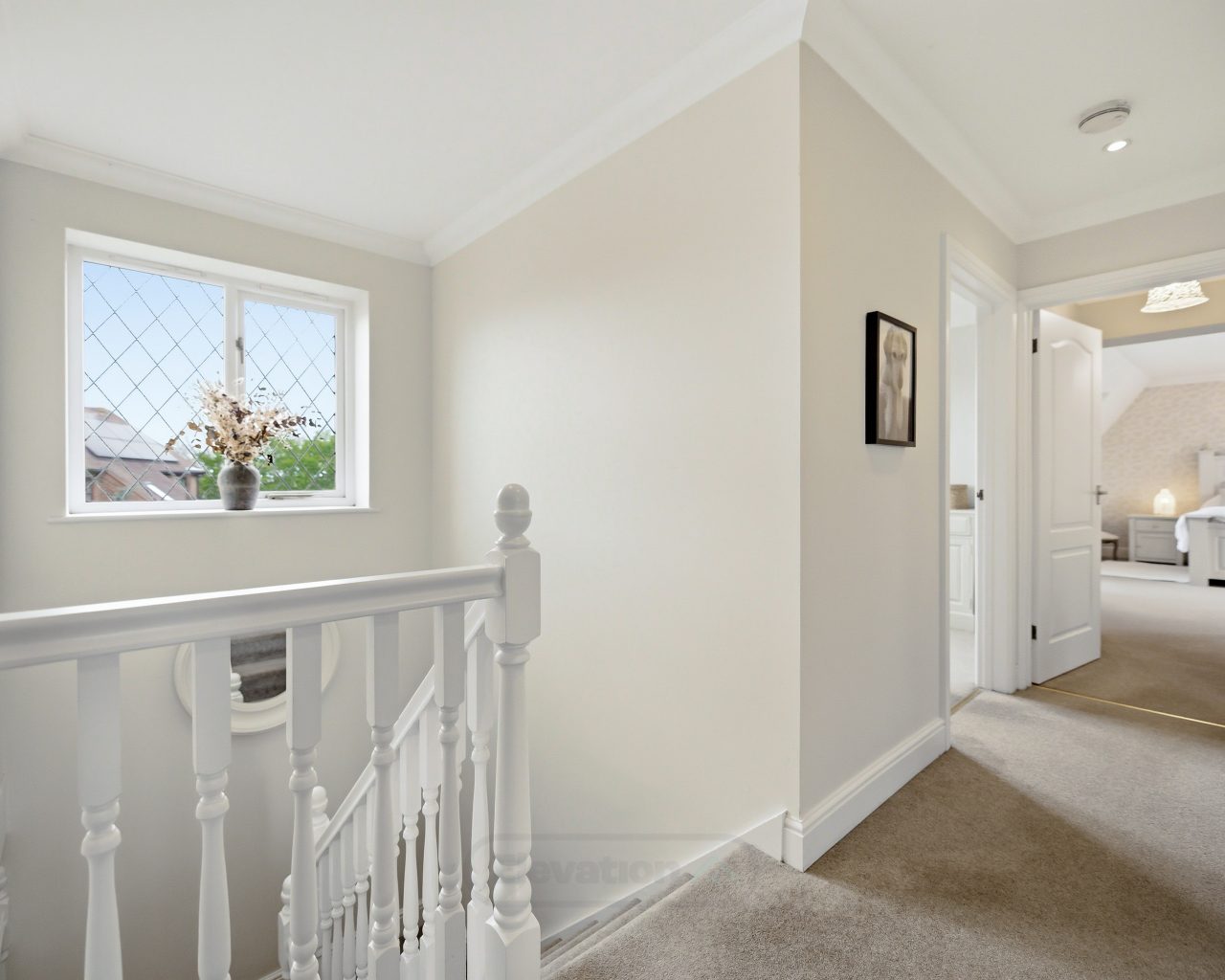 Upstairs, the first floor continues to impress with five well-appointed bedrooms. The principal suite is particularly noteworthy, offering generous proportions, a stylish en-suite shower room, and a private balcony—perfect for enjoying a morning coffee. Bedroom two and bedroom three are both excellent sizes and each benefit from their own en-suite shower rooms, adding a touch of luxury and convenience. The remaining two bedrooms are also well-sized, making them ideal for children, guests, or additional workspace. A modern family bathroom serves these rooms, completing the upper level.
