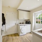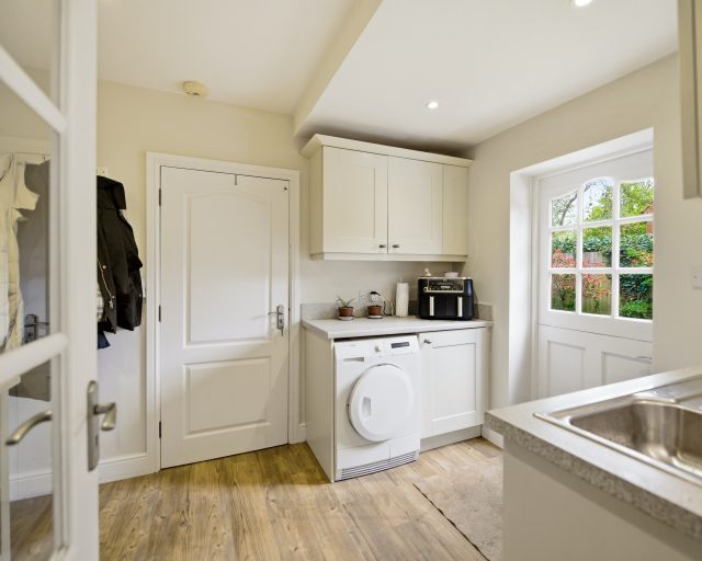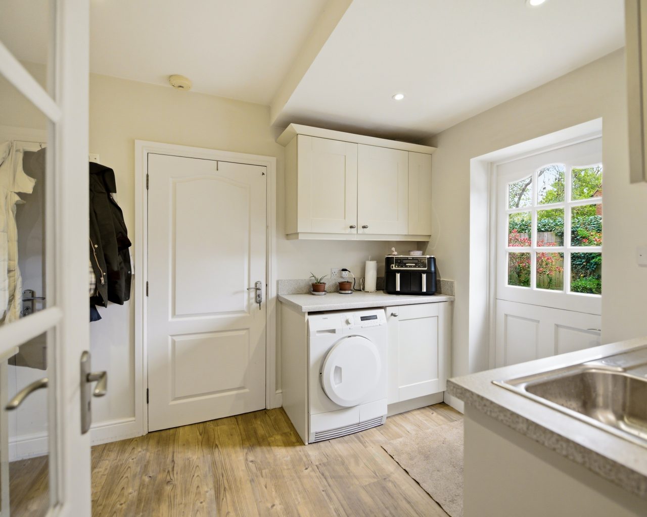 A striking skylight fills the dining area with natural light, while bi-fold doors open seamlessly onto the garden, creating an outstanding indoor-outdoor entertaining space ideal for modern family life. Complementing the kitchen is a cleverly positioned utility room, offering additional practicality and convenient access to both the garage and rear garden.
