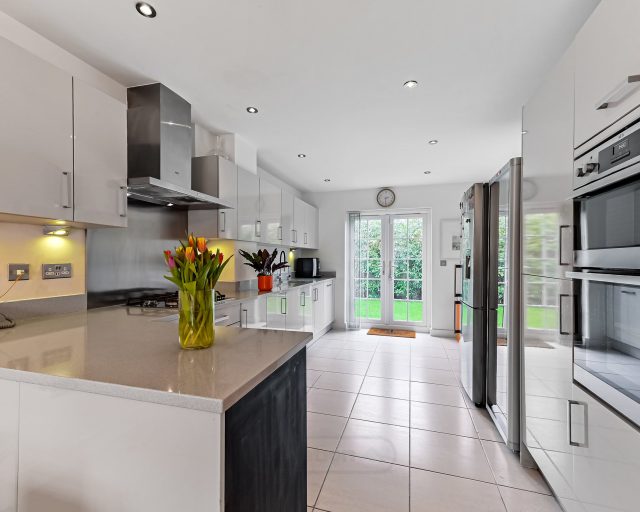 The second floor offers a further landing leading to bedroom three, bedroom four, and a main family bathroom. Externally, the property enjoys a generous rear garden predominantly laid to lawn, complemented by a landscaped tree line providing a high degree of privacy. An additional outdoor BBQ preparation / kitchen area makes this an ideal space for entertaining. To the front are attractive shrub and plant borders, with a driveway to the side providing off-road parking.