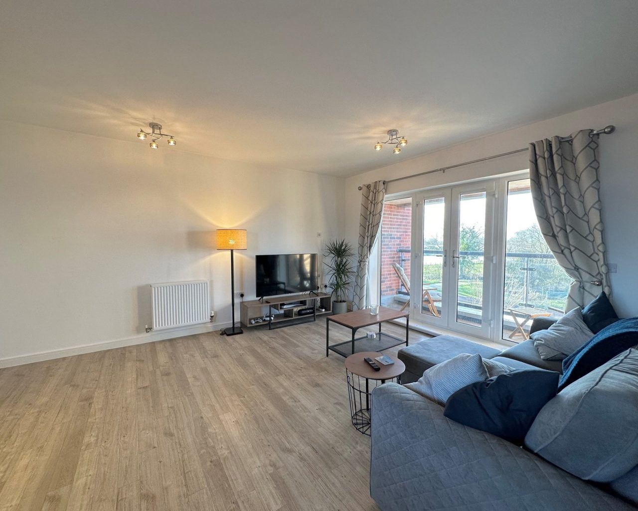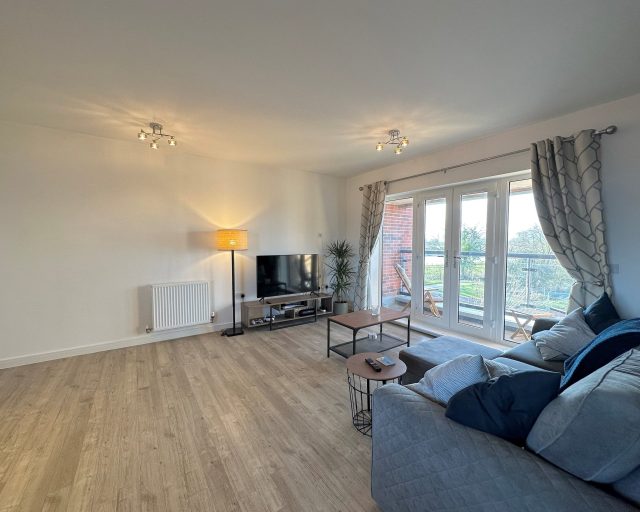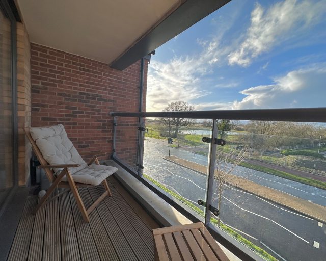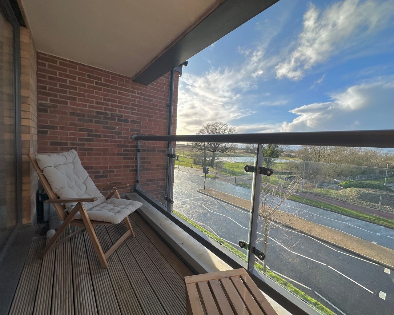 The entrance hall of the home has two large storage cupboards. The open plan living area has a modern kitchen with integrated goods to include; an oven with a gas hob, a washing machine and a fridge freezer. There is also space for a freestanding appliance. The living area has French doors to the balcony. Both bedrooms are of good size and have lots of natural light throughout.