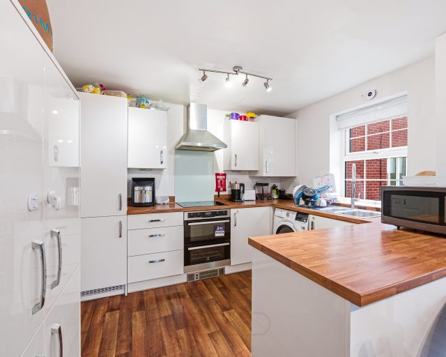 The contemporary kitchen is fitted with selected integrated appliances and features a stylish breakfast bar, creating a sociable and practical space for everyday living. Double French doors lead directly from the kitchen into a well-maintained rear garden, perfect for outdoor enjoyment.