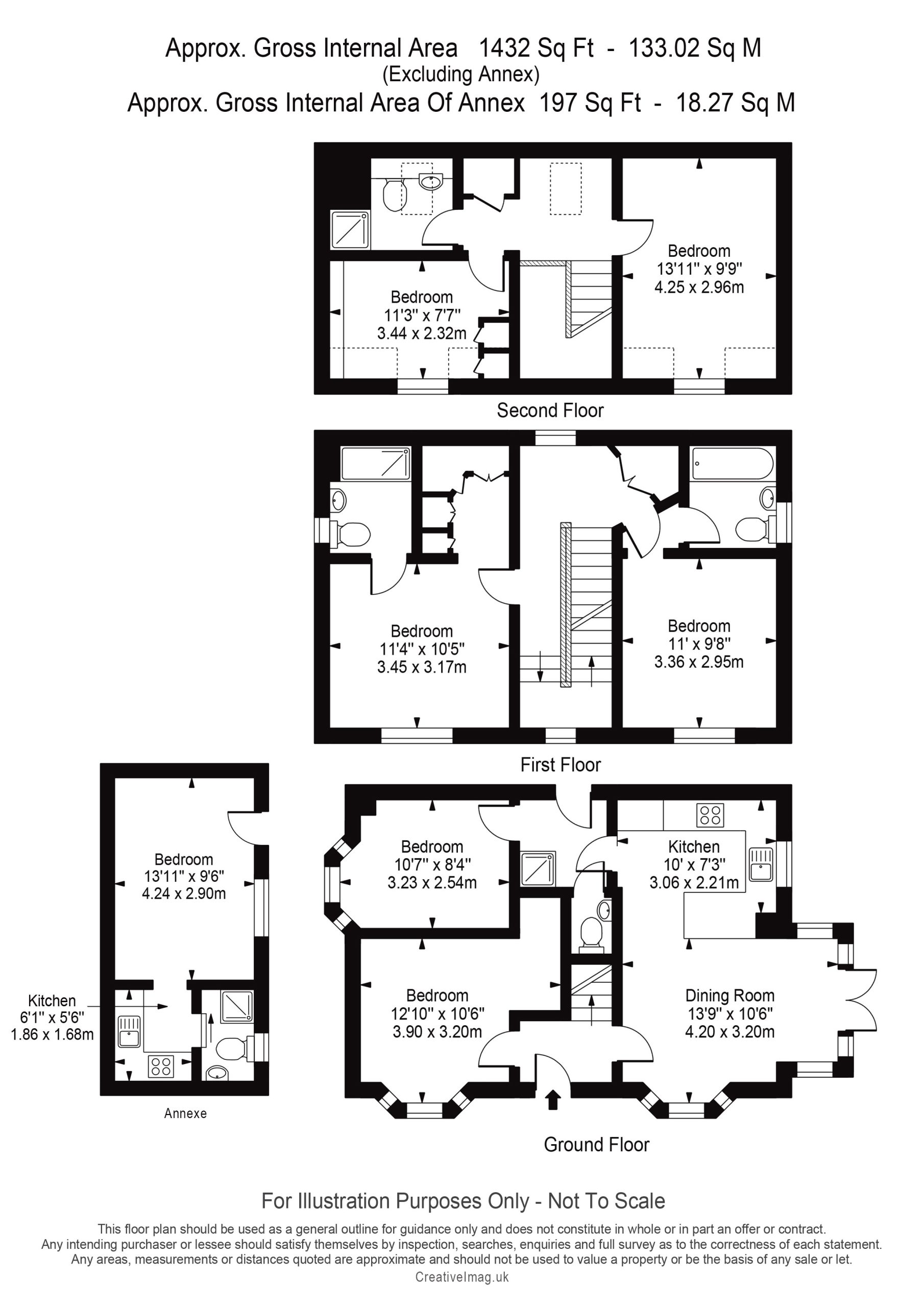 The first floor comprises two further spacious double bedrooms, both featuring integrated wardrobes and modern en-suite bathrooms. The top floor offers two additional bedrooms served by a shared three-piece shower room, completing the accommodation.