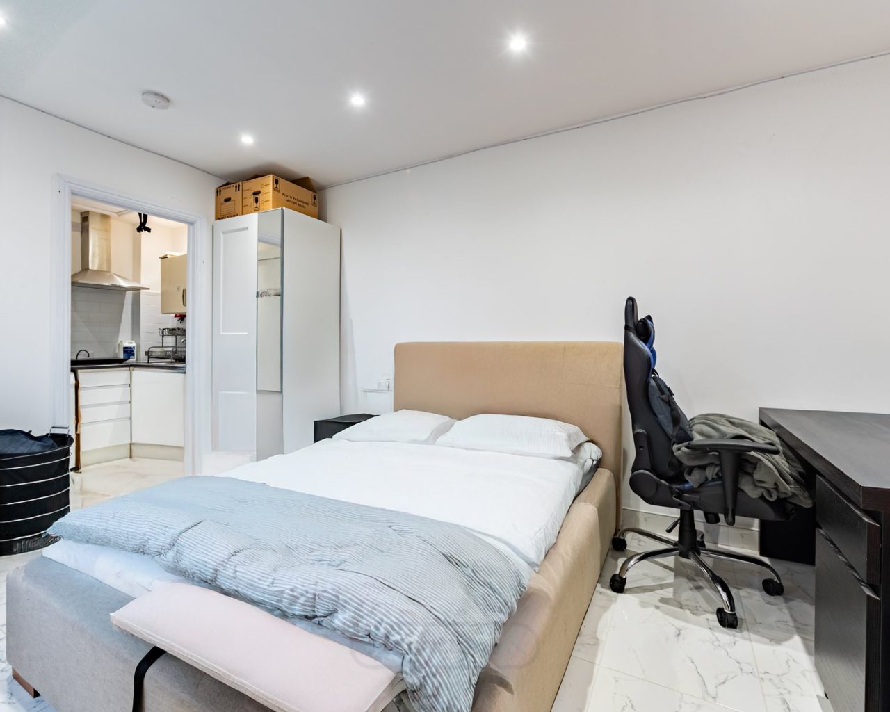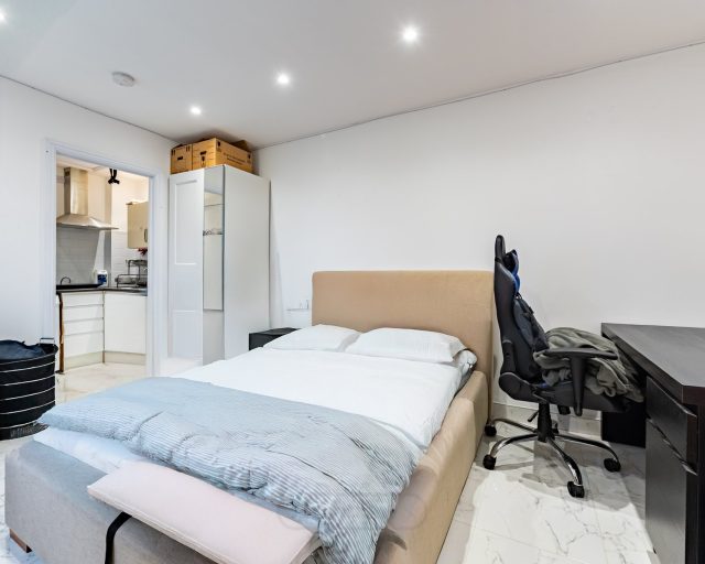 To the rear of the garden sits a converted garage, now forming a self-contained seventh bedroom. This additional space is fitted with its own kitchen and en-suite bathroom, offering excellent flexibility for multi-generational living, guest accommodation, or enhanced rental income.