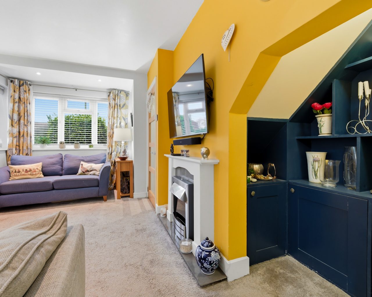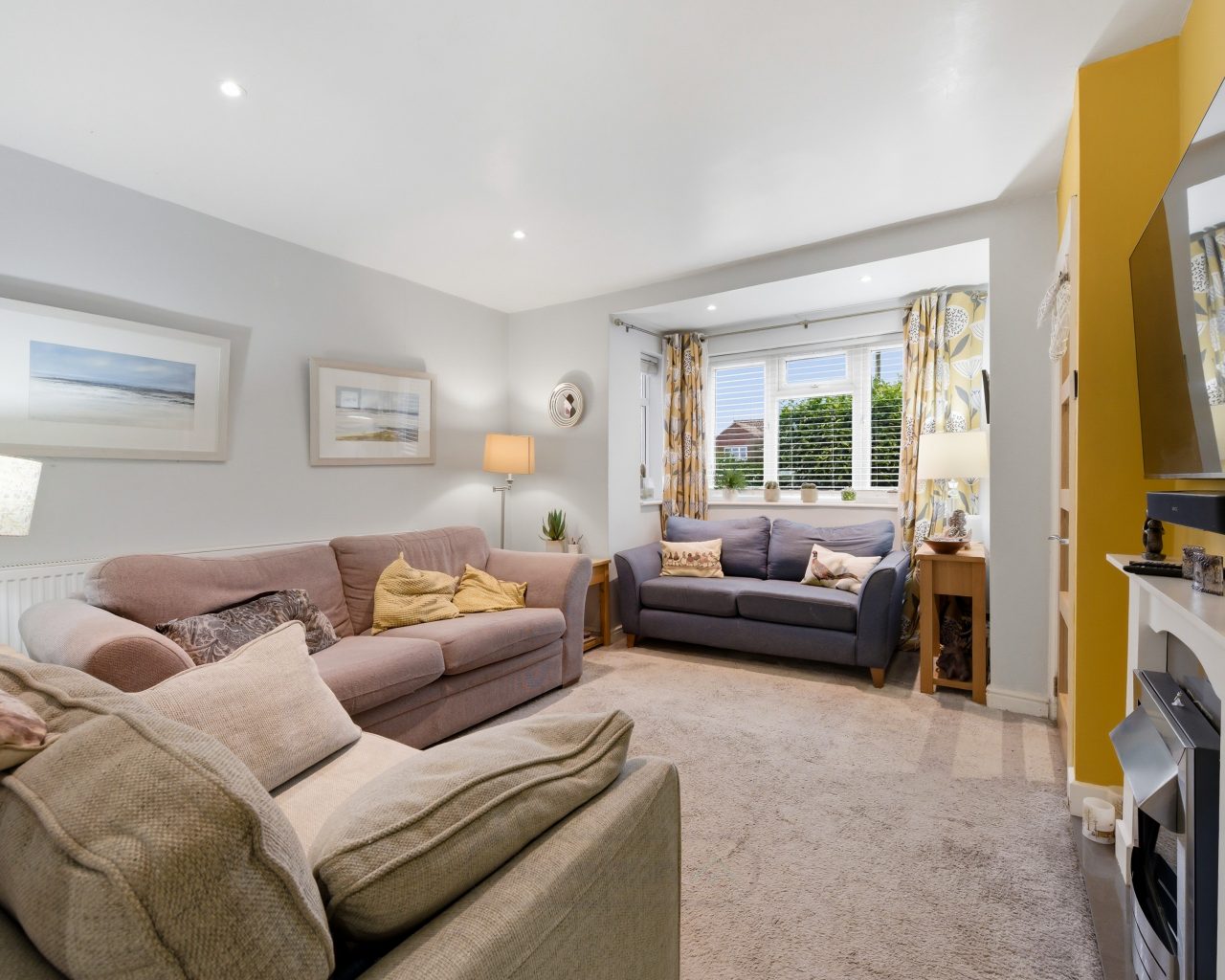 - Bright living room with bay window and feature fireplace