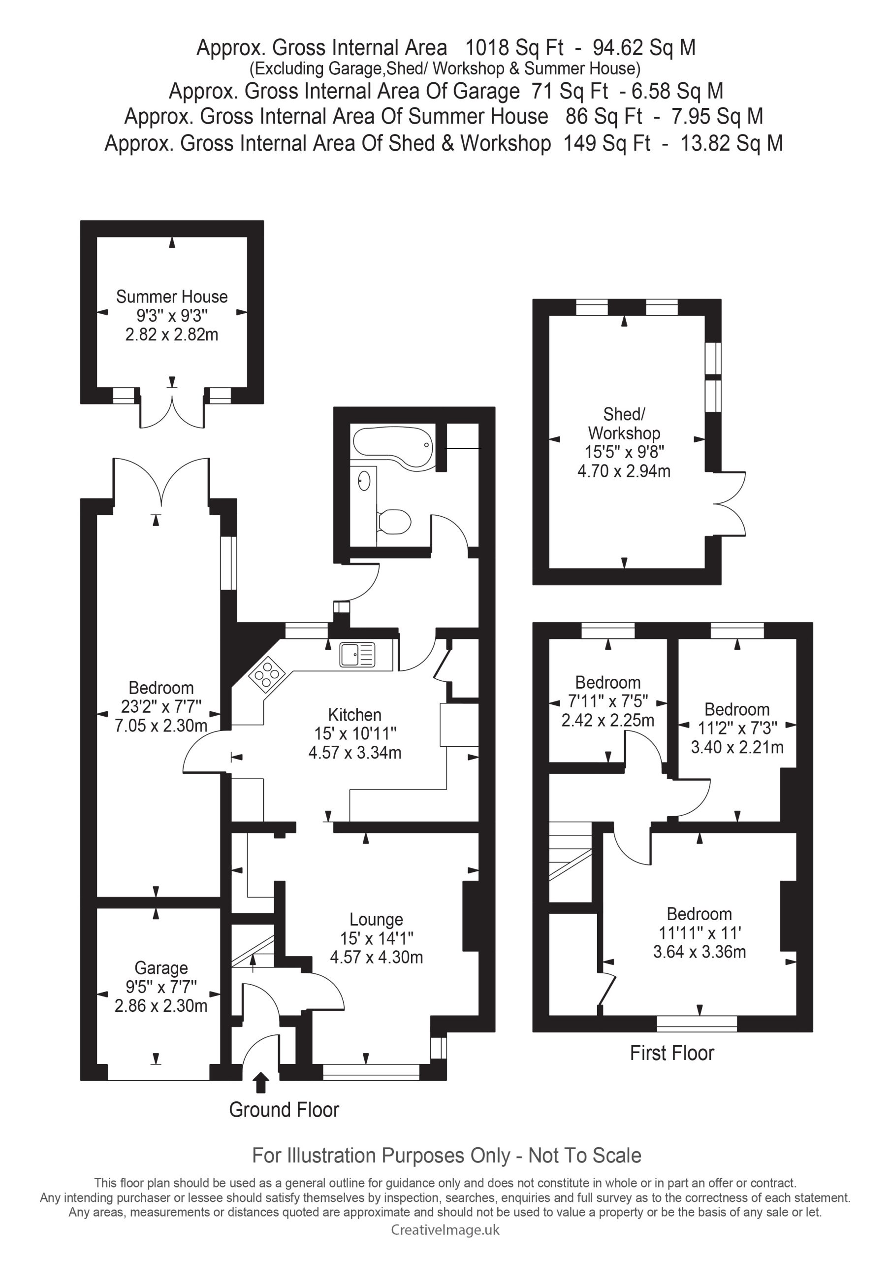 - Exceptionally large rear garden with seating area, powered summer house and workshop