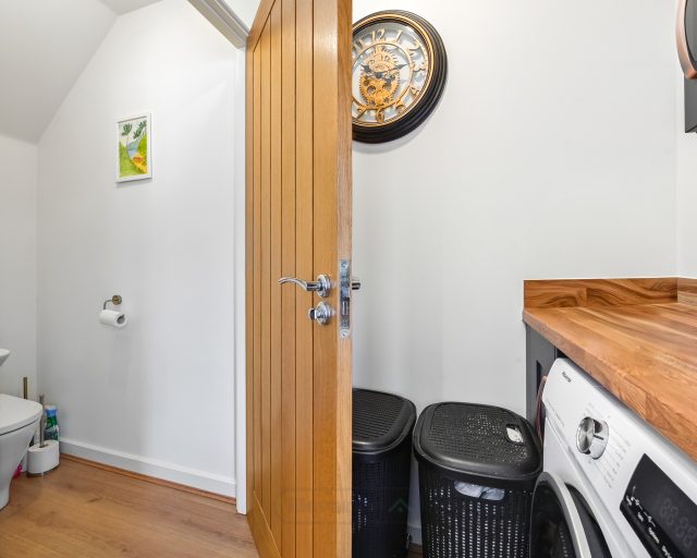 Off the kitchen is a small utility area offering additional work surface, plumbing for a washing machine, storage, and housing the wall-mounted boiler. A door from here leads to the downstairs cloakroom.