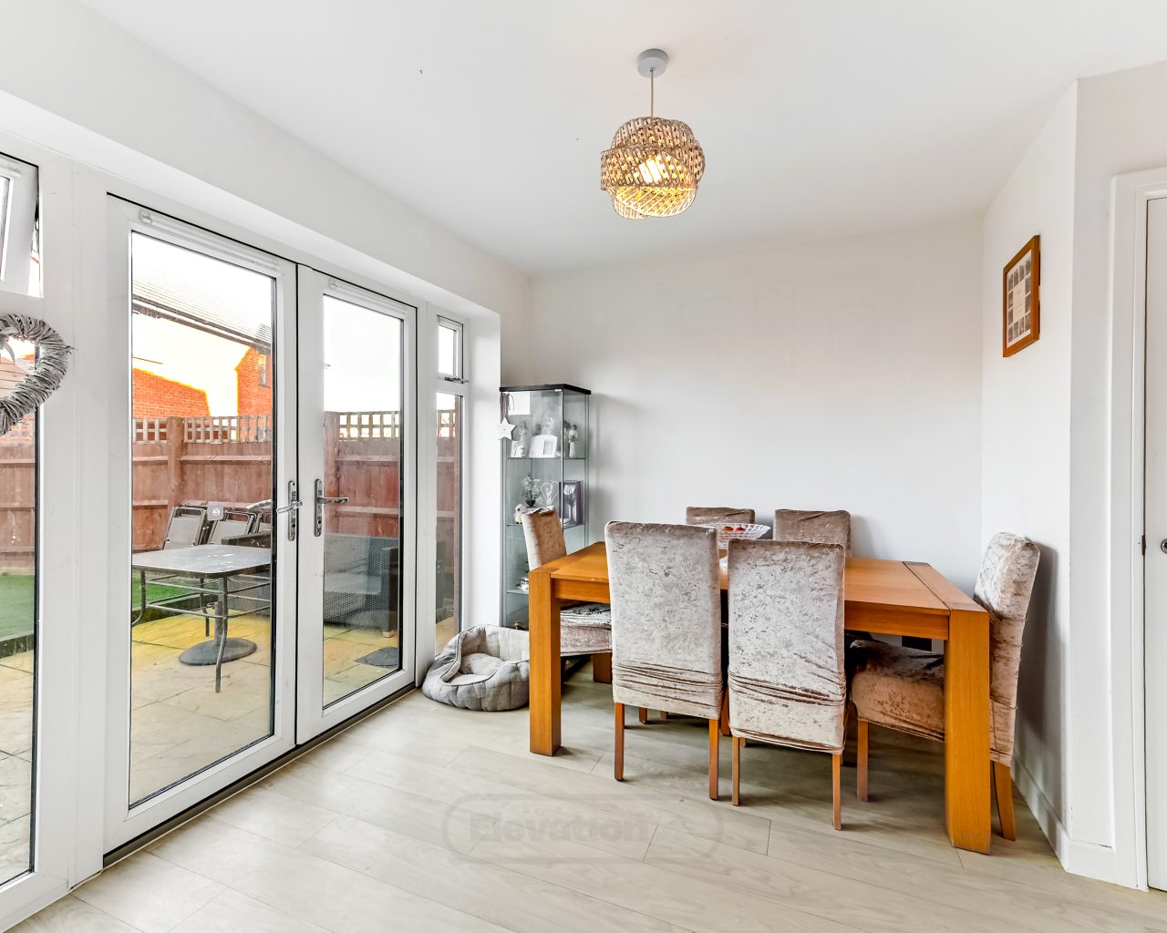 The ground floor is completed by a modern kitchen/diner, fitted with selected integrated appliances including a separate oven and worktop hob. Patio doors open directly onto the low-maintenance rear garden, creating a seamless indoor-outdoor flow and offering rear access to off-road parking for two vehicles.