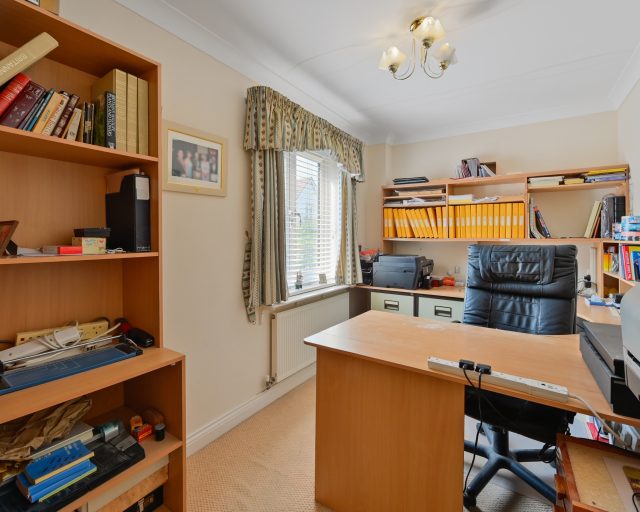Situated on a quiet residential road, this property offers generous living space, a south-facing garden, and excellent access to local amenities and schools. Upon entering the home, you are welcomed by a spacious entrance hall featuring two storage cupboards and a convenient downstairs cloakroom. The ground floor also boasts a separate study – perfect for home working – and a formal dining room ideal for entertaining.