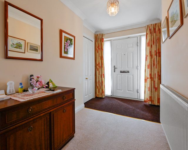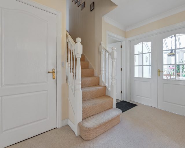 The heart of the home is the open-plan kitchen/breakfast/family room, complete with a breakfast bar, integrated Neff appliances, and a double oven, one of which is a versatile multifunction oven. Adjacent to the kitchen is a practical utility room with direct access to the garden.