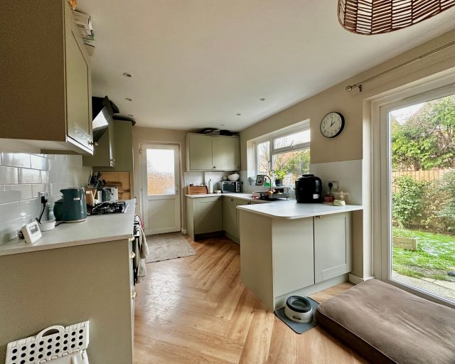To the rear, the kitchen diner provides a sociable heart of the home, fitted with selected integrated appliances including an oven and hob and a fridge freezer. Double doors open directly onto the garden, creating a seamless flow between indoor and outdoor living—perfect for summer dining and family gatherings.