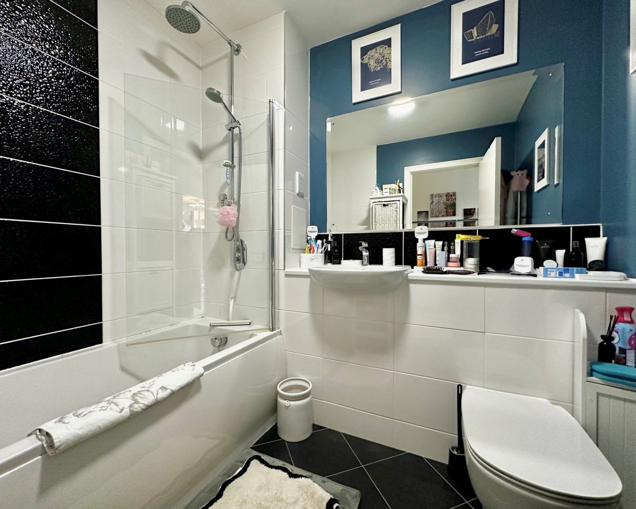- Modern three-piece bathroom suite with bath and shower