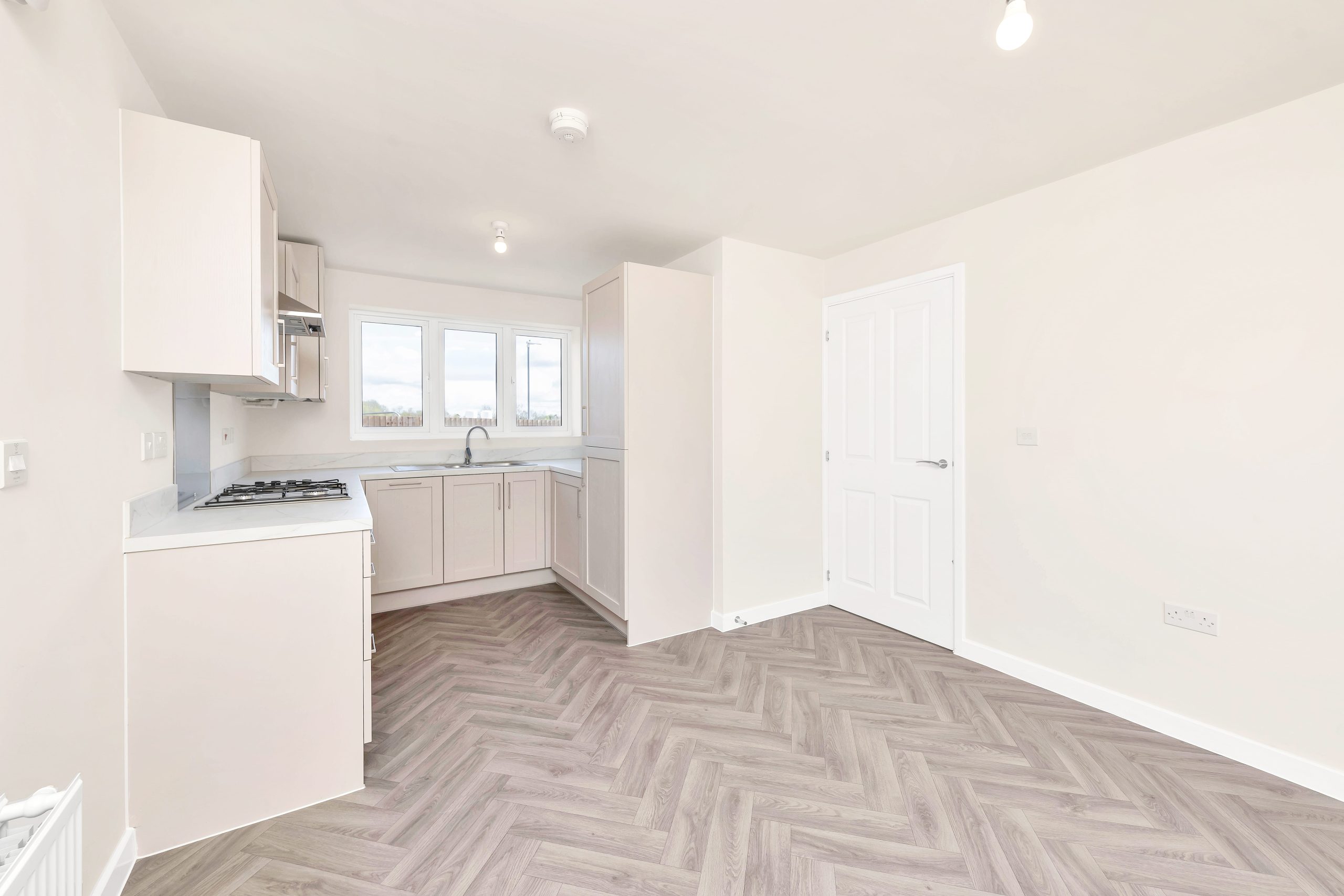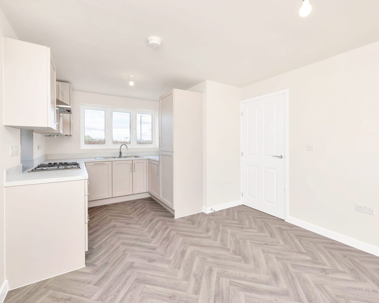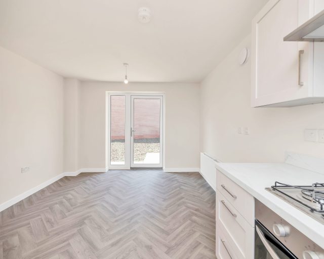 To the left, the well-proportioned lounge provides a comfortable and relaxing space for everyday living, while to the right, the contemporary kitchen/diner forms the heart of the home. Designed with both style and practicality in mind, it boasts integrated appliances and ample space for dining, with direct access to the garden—ideal for entertaining and enjoying indoor-outdoor living.