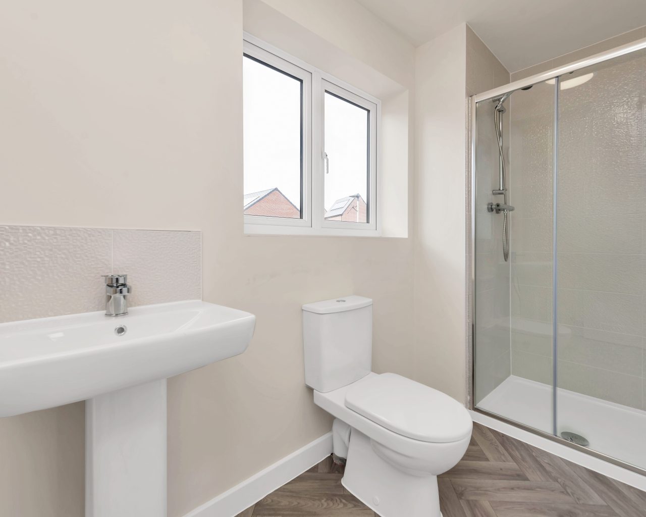 The first floor offers two generously sized bedrooms. The principal bedroom benefits from its own shower en-suite, creating a private retreat, while a modern family bathroom serves the remaining bedroom on this level.