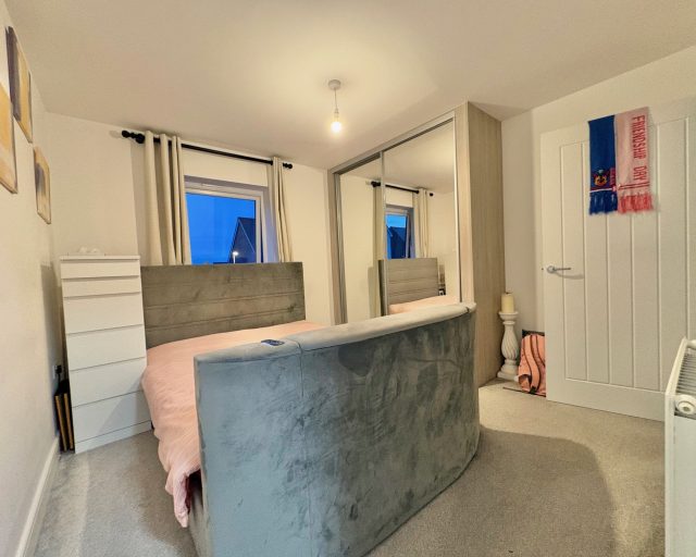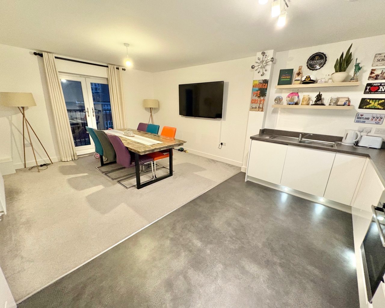 Step inside and you’ll find a bright, well-proportioned open-plan lounge, dining, and kitchen area designed with both comfort and practicality in mind. The French doors open onto a Juliet balcony providing a lovely airy feel. The modern kitchen comes fully integrated with an oven, hob, extractor fan, and fridge-freezer, complemented by stylish under-cupboard spotlights that create a warm and inviting atmosphere.