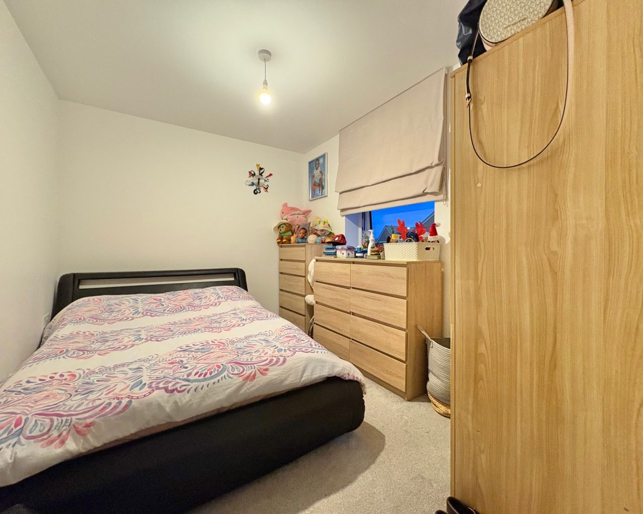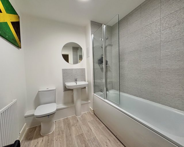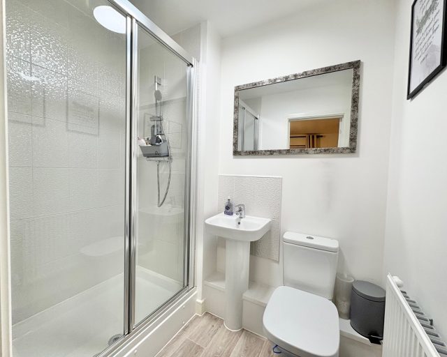 The apartment features two generous double bedrooms. Bedroom One benefits from built-in wardrobes and a private ensuite with a sleek walk-in shower. Bedroom Two is generously sized, making it perfect for a guest room, home office, or a growing child’s bedroom. A contemporary three-piece family bathroom completes the apartment, offering both style and practicality.