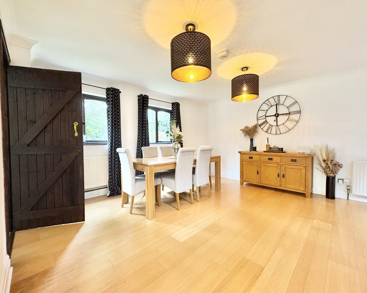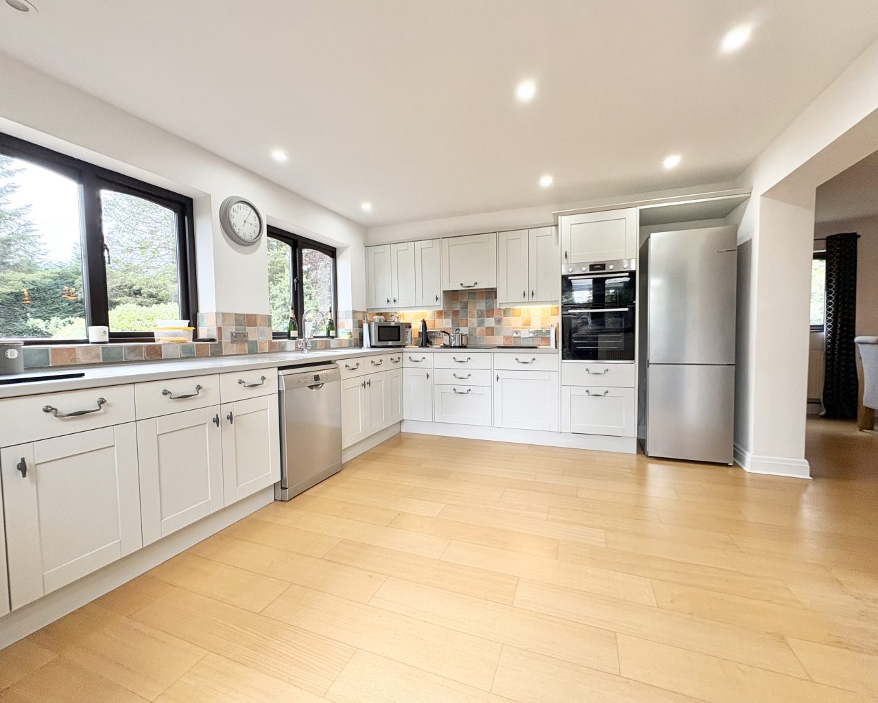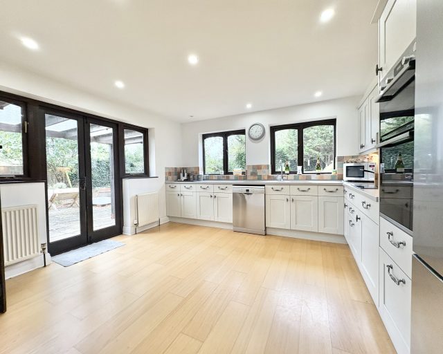 The kitchen/breakfast room enjoys a dual aspect and is fitted with a stylish range of wall and base units with Corian worktops and integrated Bosch appliances, including an eye-level oven, combination microwave/oven, and induction hob with extractor. Engineered wood flooring runs throughout, and there is ample space for a dining table, with double doors leading to the garden. A separate utility room and a cloakroom with Karndean flooring complete the ground floor.