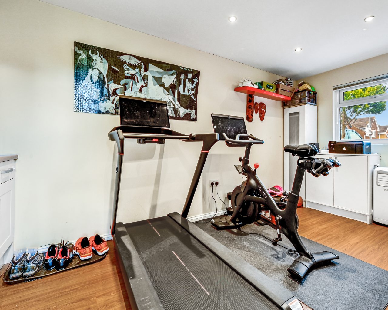 - Single garage, partly converted and currently used as a home gym