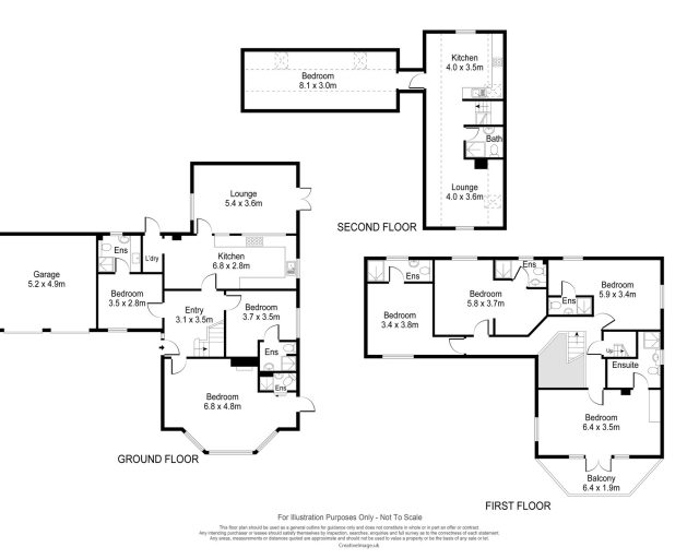 Arranged over three floors, the accommodation is extensive and flexible. The ground floor provides multiple reception spaces, a generous kitchen, utility/laundry area, several bedrooms (many with en-suite facilities), and an integral garage. The first floor offers further spacious bedrooms, most with en-suites, including a bedroom with access to a private balcony. The second floor functions almost as a self-contained level, featuring its own lounge, kitchen, bathroom, and a large bedroom—ideal for extended family, older children, or guest accommodation.