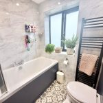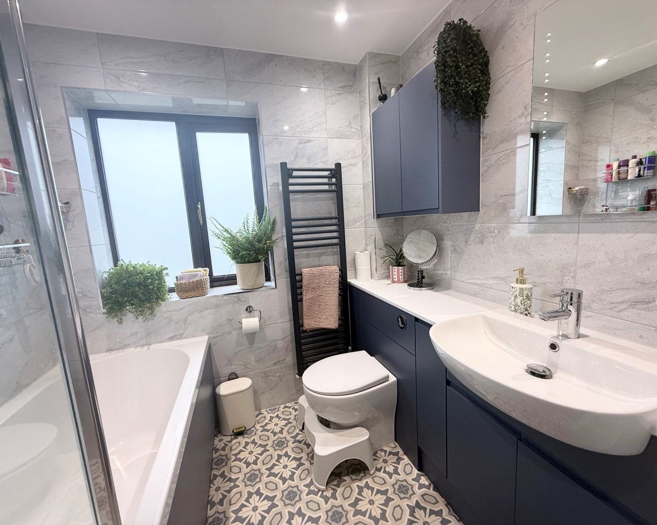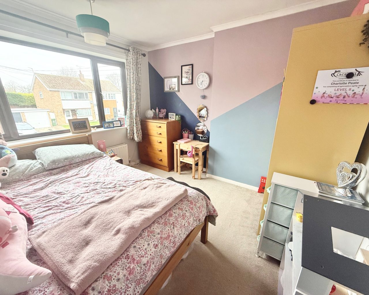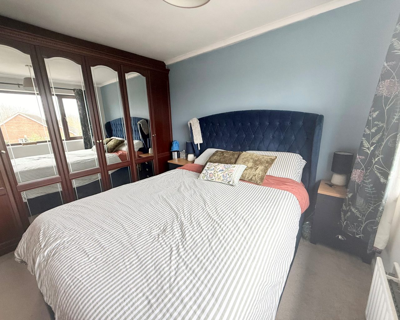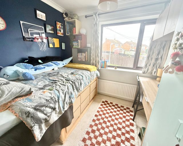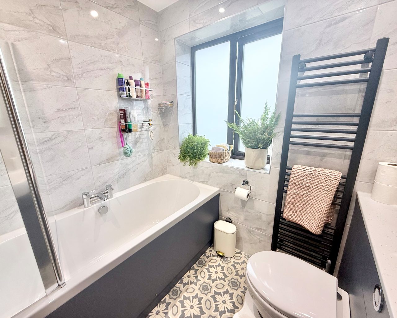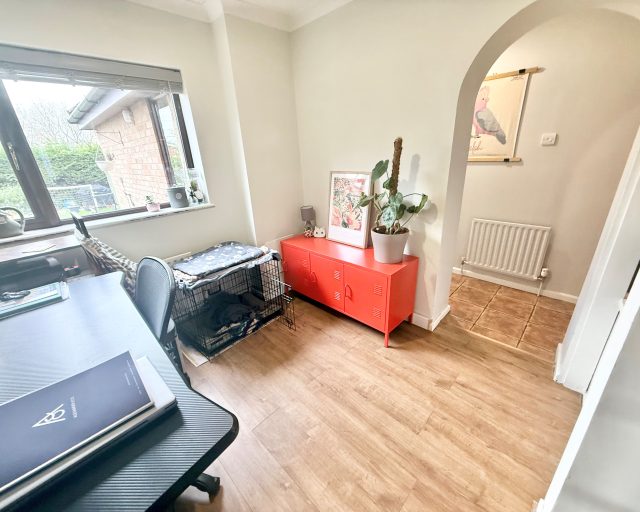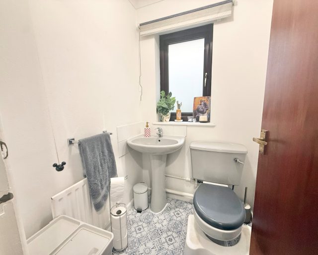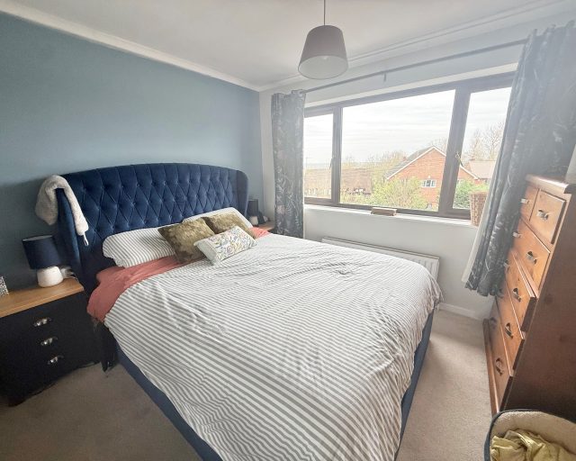 Upstairs, the property offers three well-proportioned bedrooms. Bedroom one is a comfortable double room featuring built-in wardrobes and lovely open views from the window, creating a bright and peaceful retreat. Bedroom two is also a spacious double bedroom, while bedroom three, though more compact, is a practical and versatile space that could serve perfectly as a child’s bedroom, nursery, dressing room, or home office. The first floor is completed by a modern three-piece family bathroom, finished in a contemporary style.