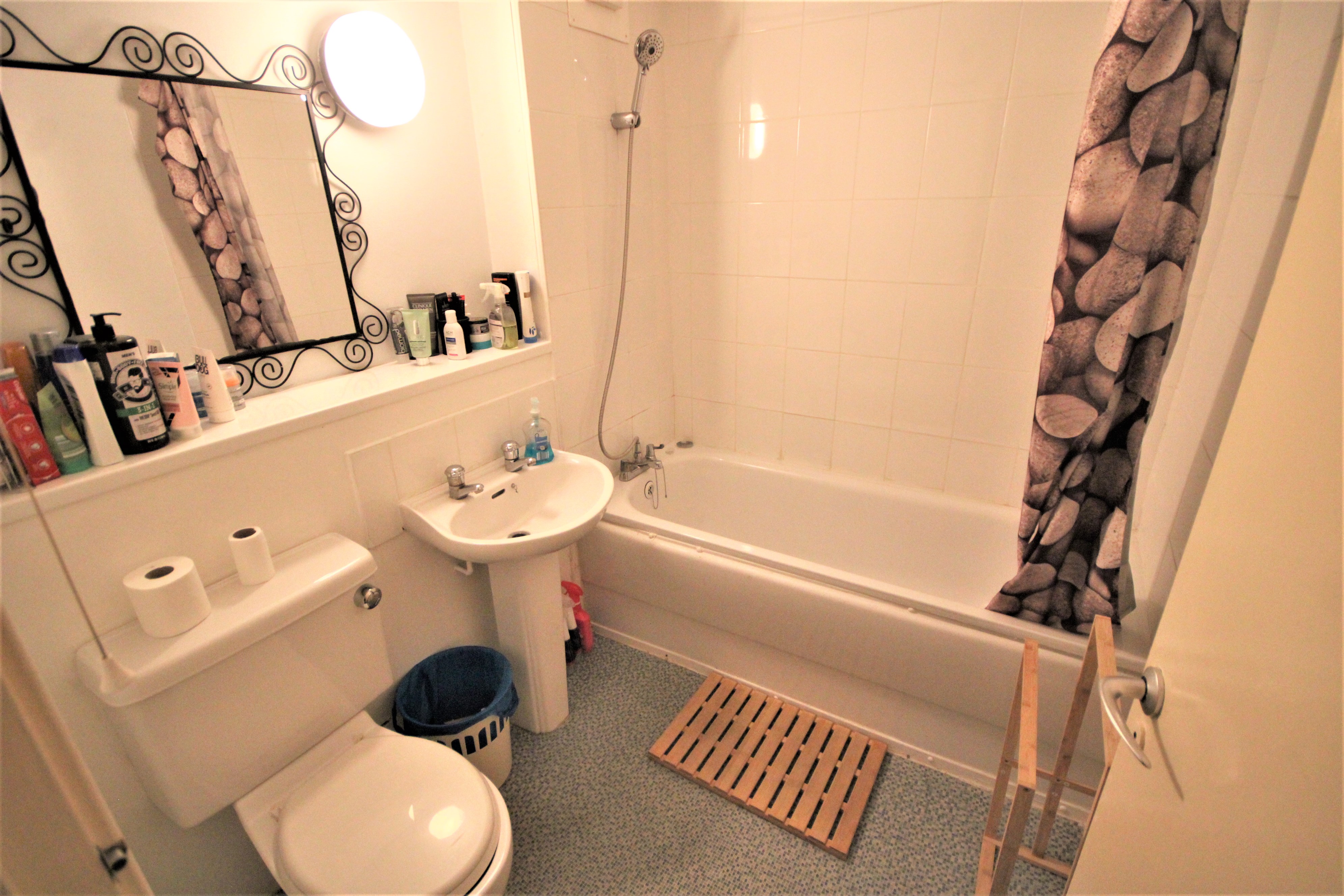Bathroom - Comprising a low-level WC, a wash hand basin and a panelled bath with an overhead shower.