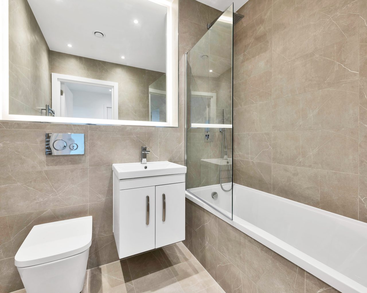 The well-proportioned bedroom provides a comfortable retreat, while the modern bathroom is fully tiled floor to ceiling and finished to a high standard, complete with a large illuminated wall mirror and heated towel rail.