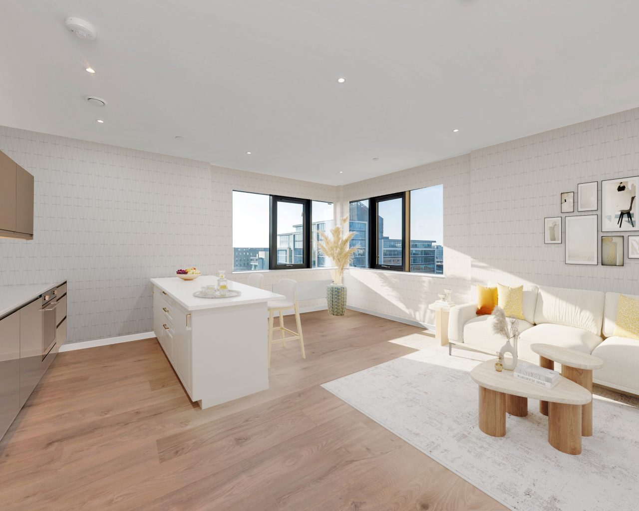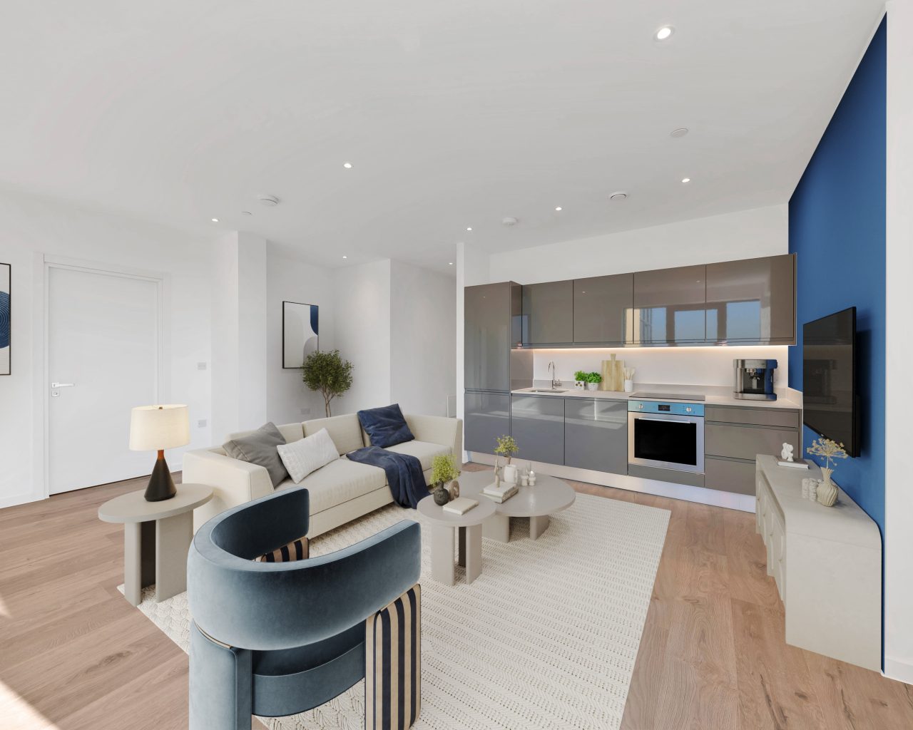 The kitchen is finished to Tempus House's high specification: dusk grey lucent high-gloss handleless cabinets, premium quartz worktops, fully integrated appliances, and scratch-resistant engineered wood flooring, delivering a sleek, contemporary finish.