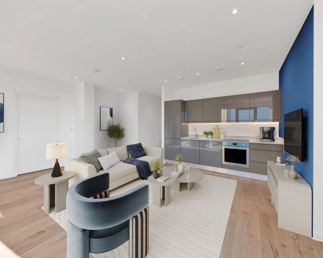The apartment enjoys a bright, modern feel throughout, with a thoughtfully arranged layout centred around a generous open-plan kitchen, living, and dining area. Glazed doors lead directly onto the corner balcony, creating a seamless connection between indoor and outdoor space while capturing panoramic views across the city, a rare and sought-after feature in Central Milton Keynes.