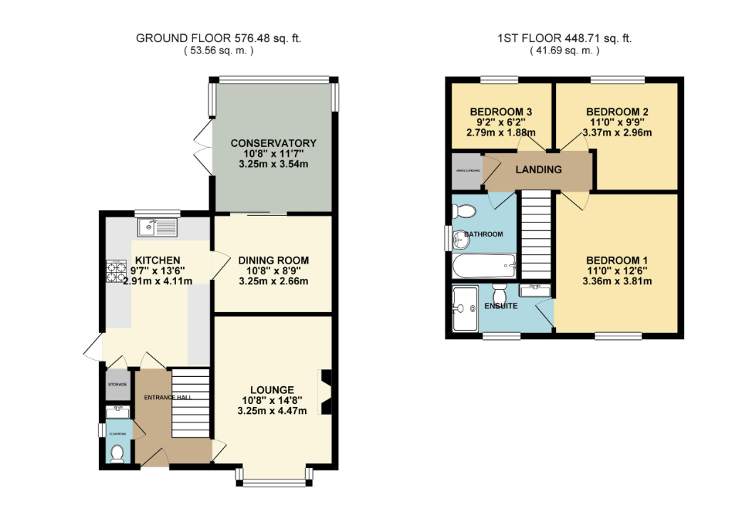Upstairs, the home offers three well-proportioned bedrooms. The main bedroom benefits from built-in wardrobes and a private en-suite shower room, providing a comfortable and private retreat. Two further bedrooms are served by a modern family bathroom, making this an ideal layout for growing families. Further benefits include a garage and two allocated parking spaces, ensuring ample off-road parking.
