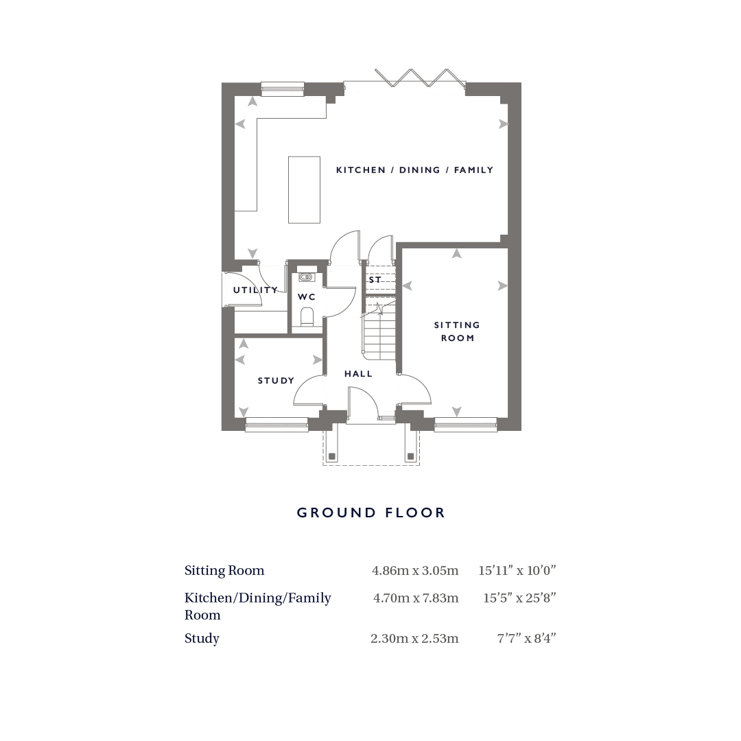 From the moment you step inside, the sense of space and natural light is immediately apparent. A welcoming entrance hall leads to a substantial dual-aspect sitting room measuring over 15ft in length, creating a superb setting for relaxing or entertaining. Across the hall, a separate study provides the ideal work-from-home space, playroom or snug.