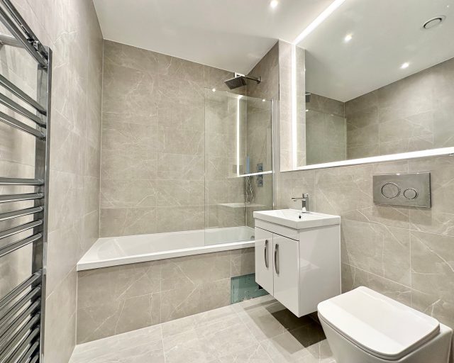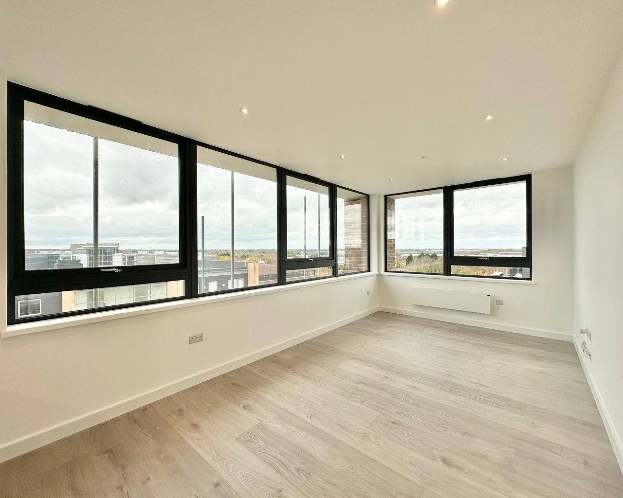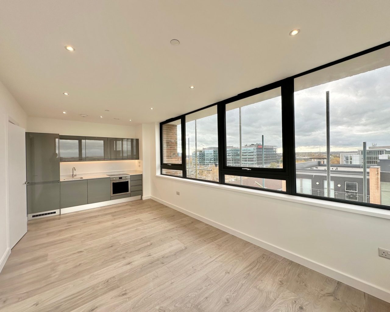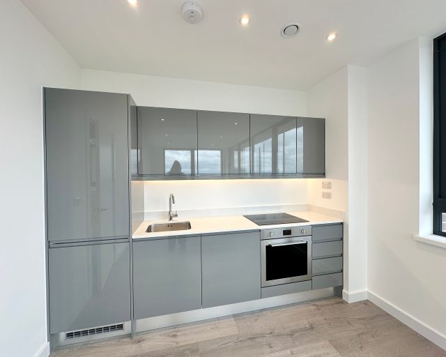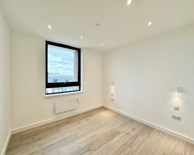 This brand new apartment has been thoughtfully designed to maximize space and light, featuring a spacious open-plan kitchen, dining, and living area with large windows that flood the space with natural light and views across central Milton Keynes. The contemporary kitchen comes complete with high-quality fittings, and the entire apartment is finished with high quality flooring and ultra-high ceilings that enhance the sense of openness and sophistication. The generously sized double bedroom offers a flexible layout. The main bathroom is fully tiled and features a shower-over-bath, heated towel rail, and a large LED-lit mirror, combining function with style.
