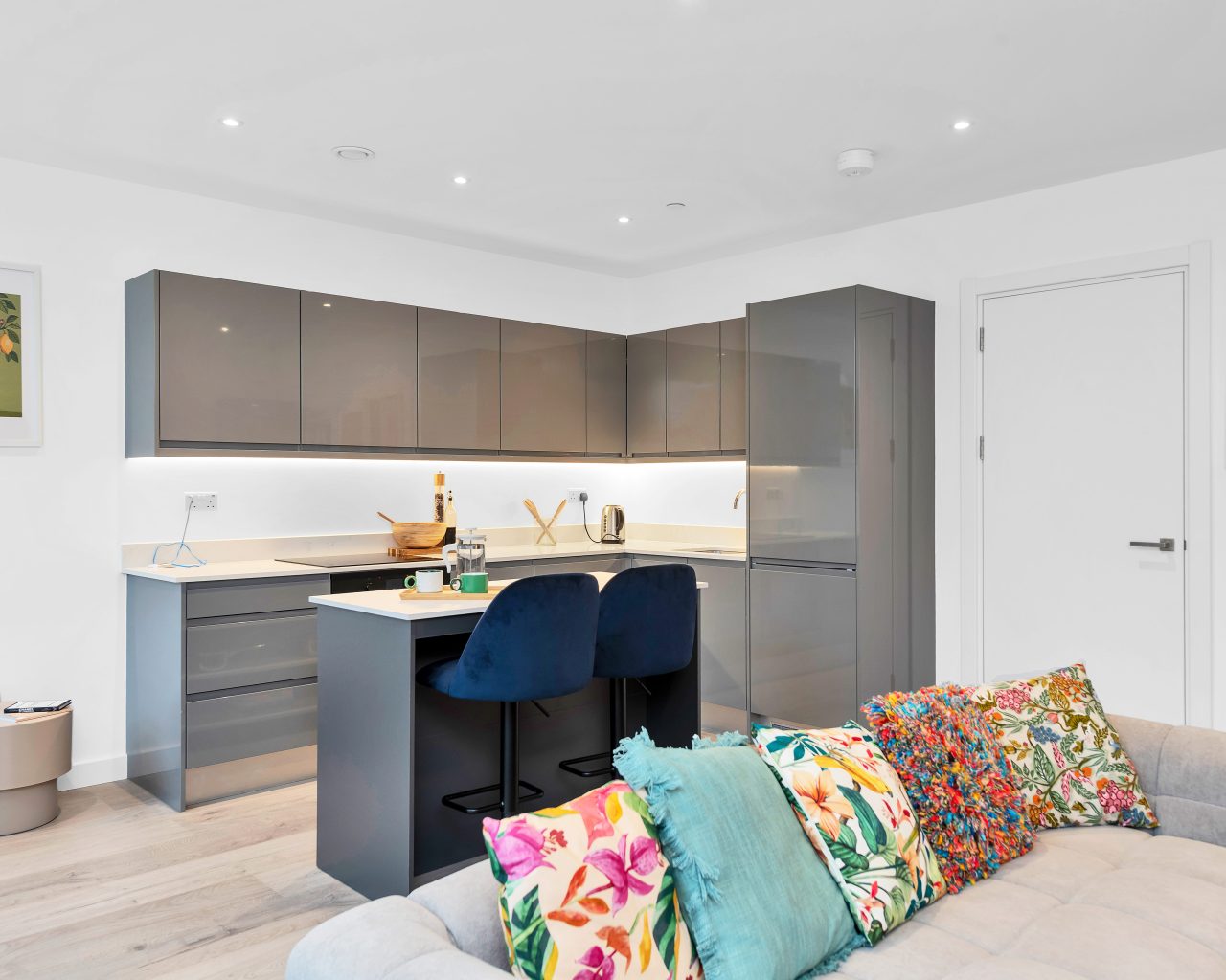 The kitchen is finished to a high specification, featuring dusk grey lucent high-gloss handleless cabinets, premium quartz worktops, fully integrated appliances, and scratch-resistant engineered wood flooring, delivering a sleek and contemporary finish.