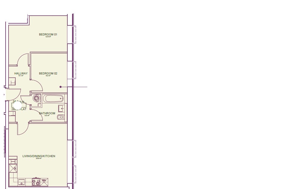 The apartment features a well-planned layout with two good-sized bedrooms. At the heart of the home is the spacious open-plan kitchen, living, and dining area, providing a bright and comfortable environment for both relaxing and entertaining. The kitchen is finished to a high specification, featuring dusk grey lucent high-gloss handleless cabinets, premium quartz worktops, fully integrated appliances, and scratch-resistant engineered wood flooring, delivering a sleek and contemporary finish.