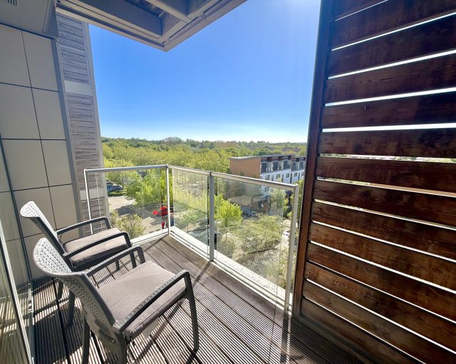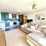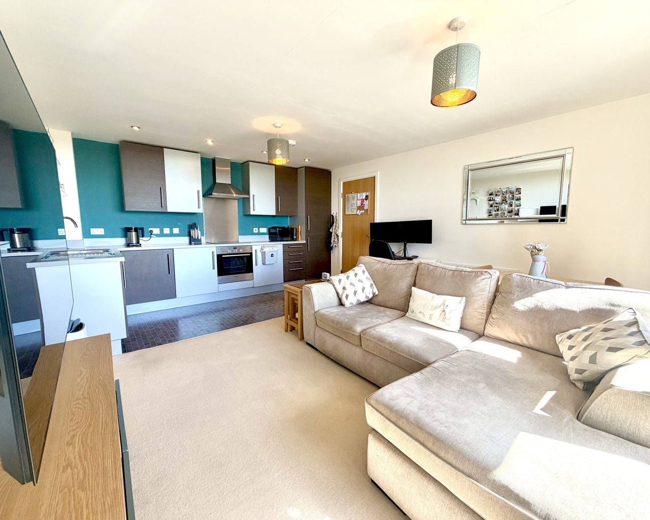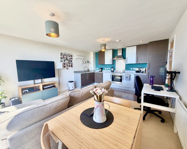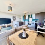 The apartment offers bright, well-proportioned accommodation, including a modern fitted kitchen with integrated appliances and an open-plan living area designed for comfortable, contemporary living. Large windows allow for plenty of natural light, while the private balcony provides stunning elevated views — perfect for relaxing or entertaining.