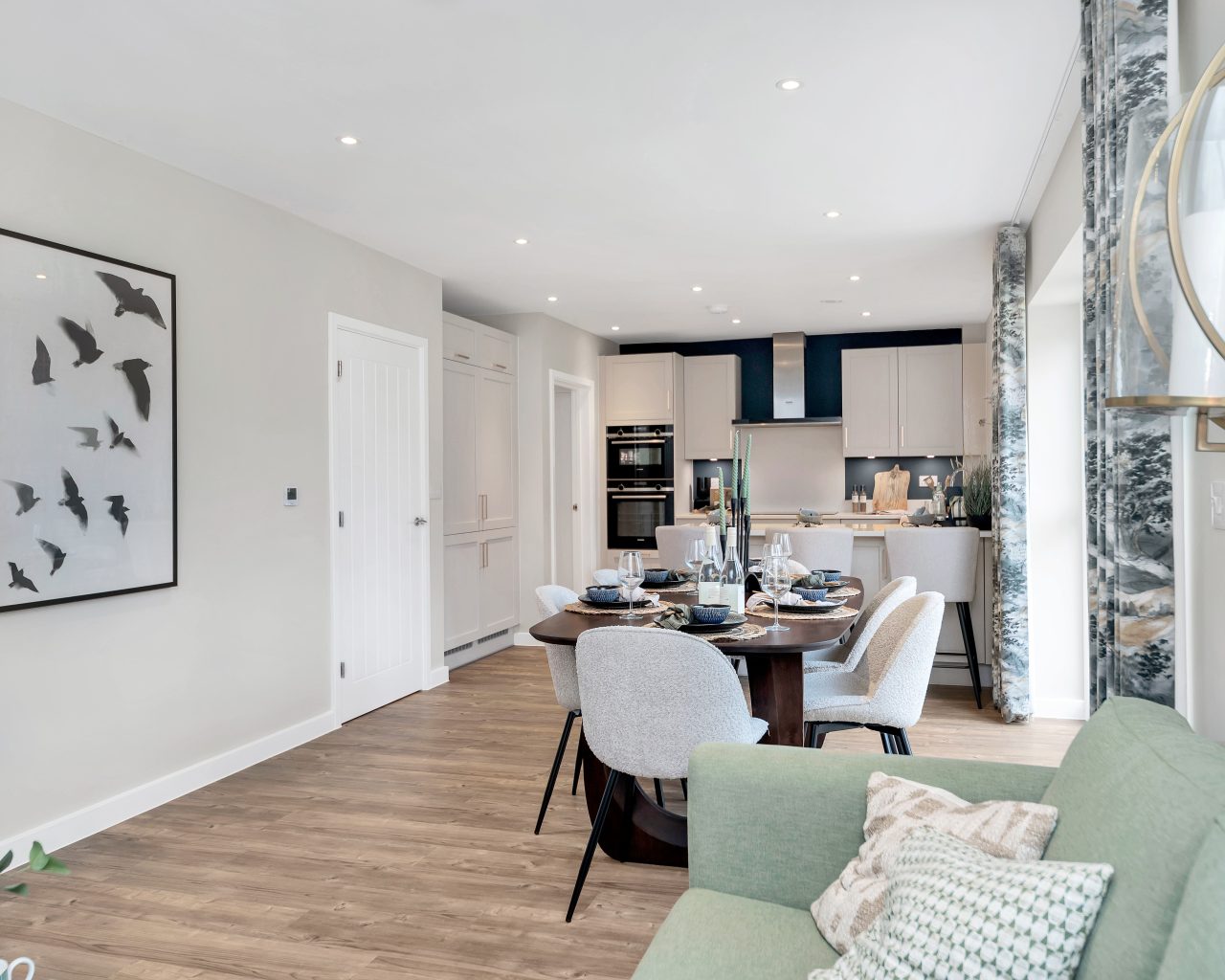 To the rear lies the true centrepiece of the home: an impressive 32ft+ open-plan kitchen, dining and family space. Designed with both entertaining and everyday living in mind, this expansive area features sleek cabinetry, integrated Siemens and Bosch appliances, a Quooker boiling water tap, and extensive glazing with doors opening onto the private rear garden. A separate utility room provides additional practicality and keeps the main living area beautifully streamlined.