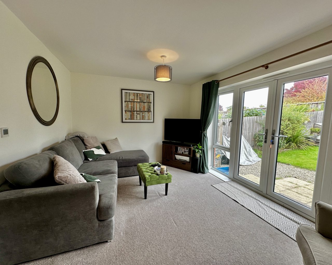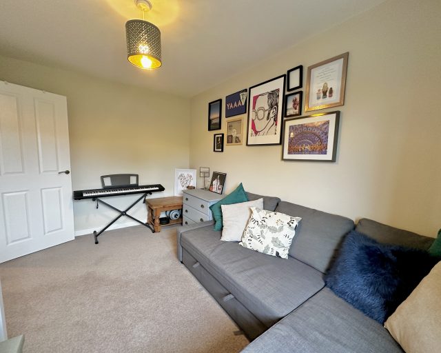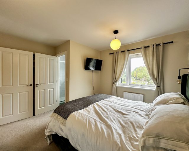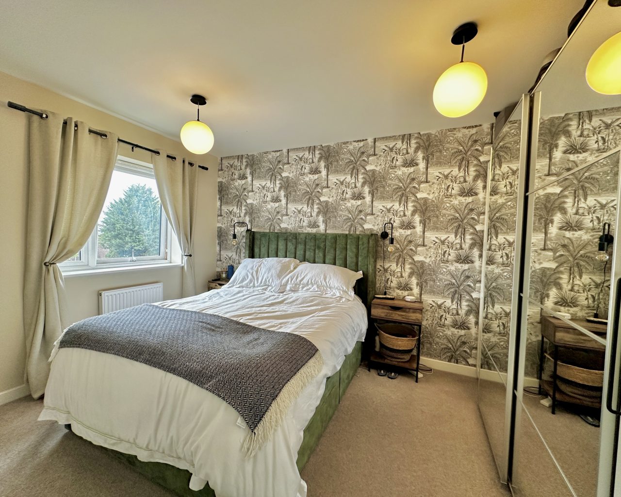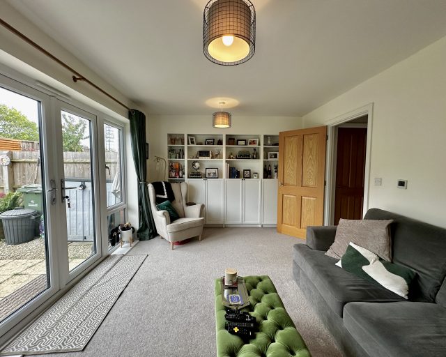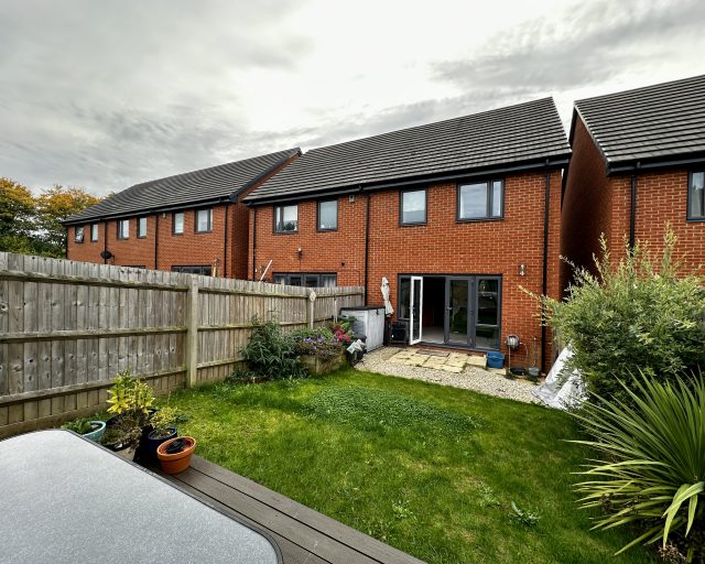 Finished to a high specification throughout, the property offers spacious and modern living. On the ground floor, you’ll find a welcoming entrance hall with a downstairs WC, a generous kitchen/diner with ample storage, and a large lounge featuring a bespoke built-in media wall. French doors lead out to a private rear garden, complete with decking and fencing for added privacy – perfect for relaxing or entertaining.