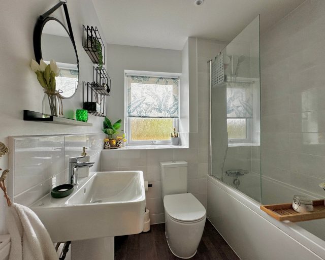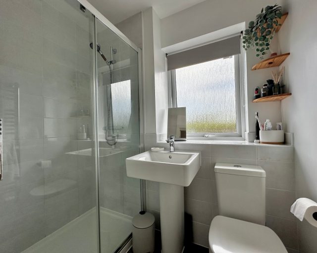 Finished to a high specification throughout, the property offers spacious and modern living. On the ground floor, you’ll find a welcoming entrance hall with a downstairs WC, a generous kitchen/diner with ample storage, and a large lounge featuring a bespoke built-in media wall. French doors lead out to a private rear garden, complete with decking and fencing for added privacy – perfect for relaxing or entertaining.